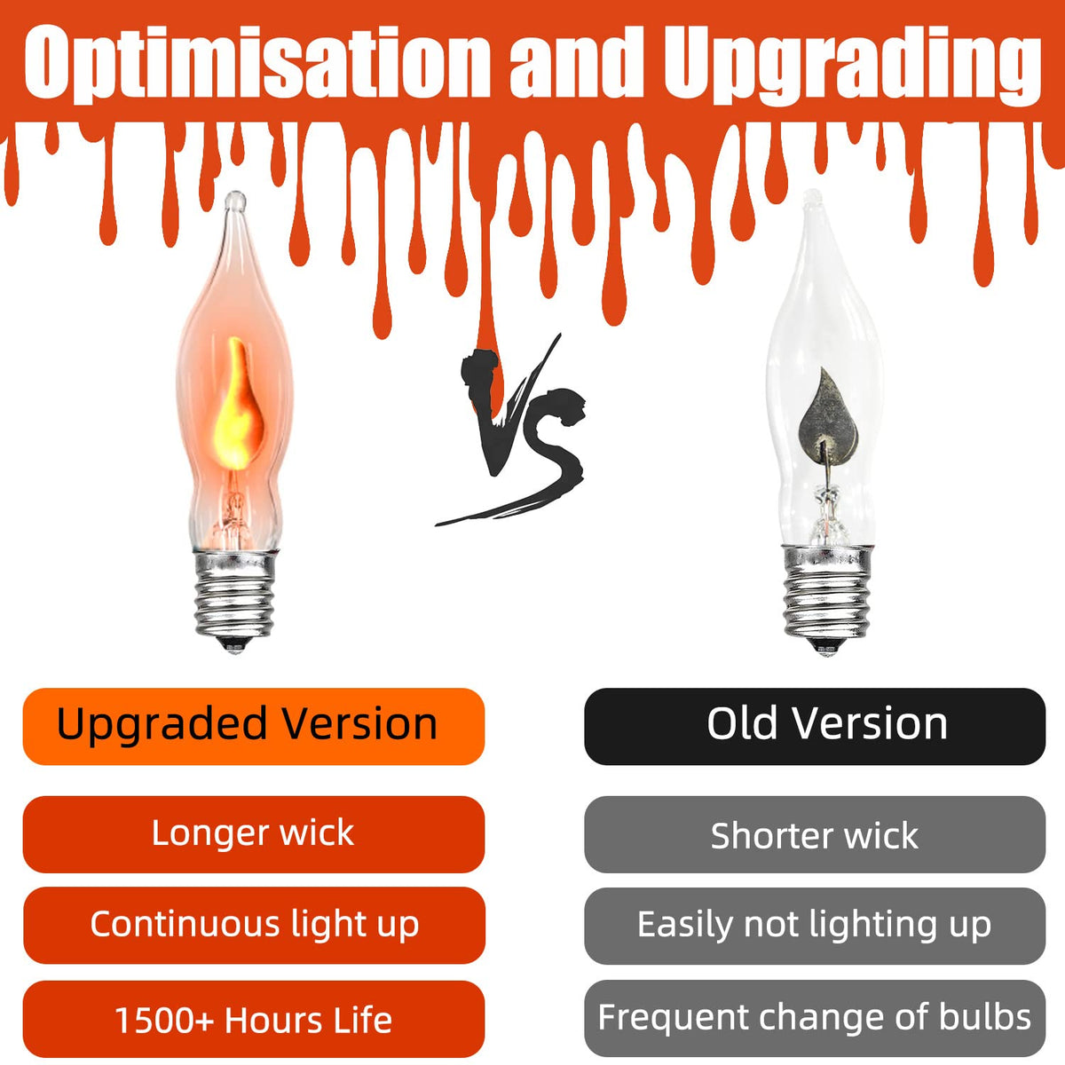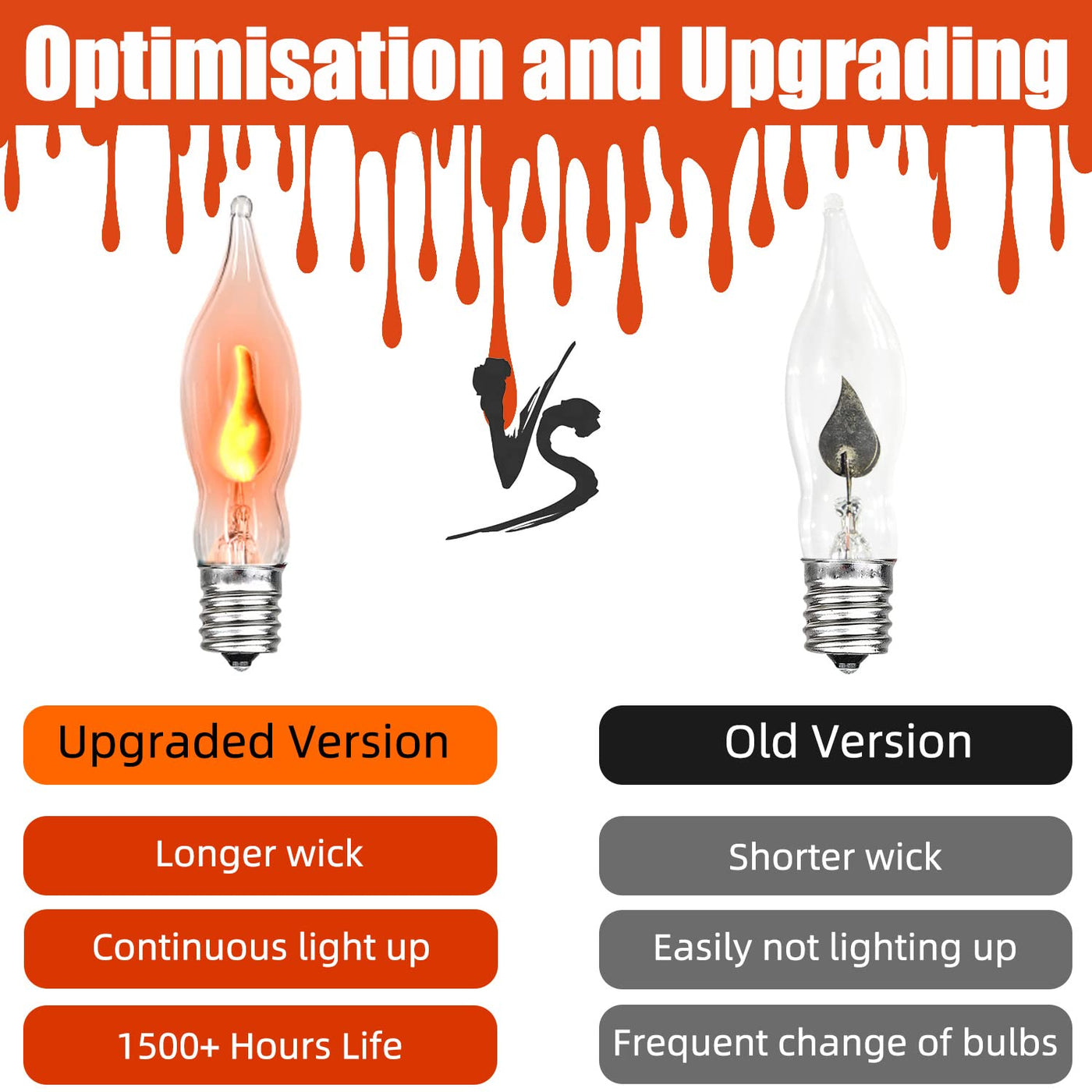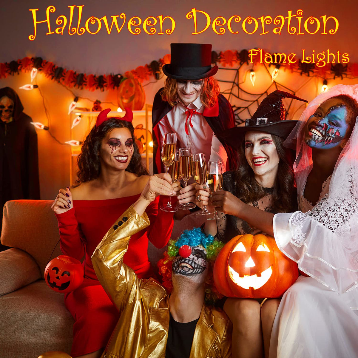 This Halloween Flickering Flame String Lights is suitable use for Outdoors and Indoors, When the light string is powered on, the wick is jumping like a real candle flame, which can be as a great alternative to candle light without worrying about burning. The string lights is simple and safe to use, so you can decorate anywhere you want, for example, as Halloween string lights, tree lights, garden lights, party lights, lawn lights, patio lights, camping lights, door lights, balcony lights , window lights, ect. String light parameters UL listed C7/E12 base 120V power 1W per bulb, 10W per string 10 Ft long per string 10 flame bulbs per string Max 43 string lights connect End-to-end connection Connected in parallel This amazing Christmas lights greatly adds a festival atmosphere to your Christmas, sincerely wish you enjoy the wonderful holiday time with your friends and family under the flickering flame string lights