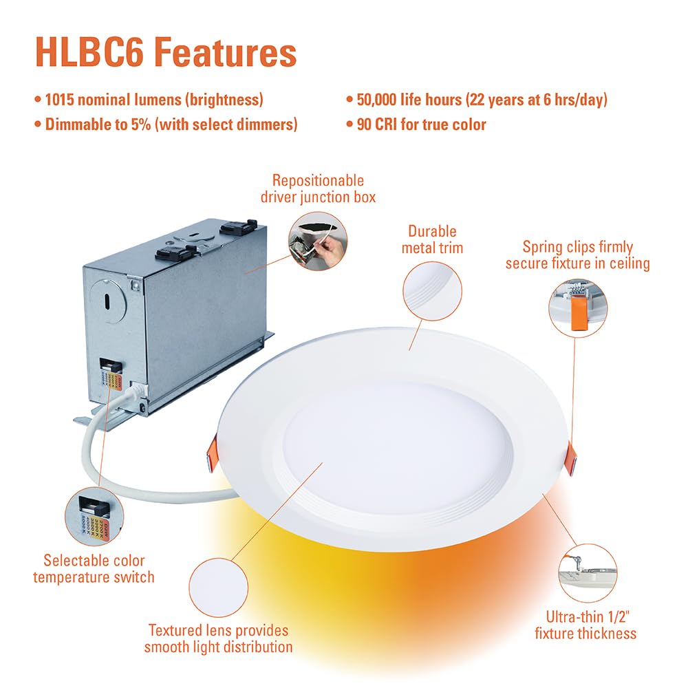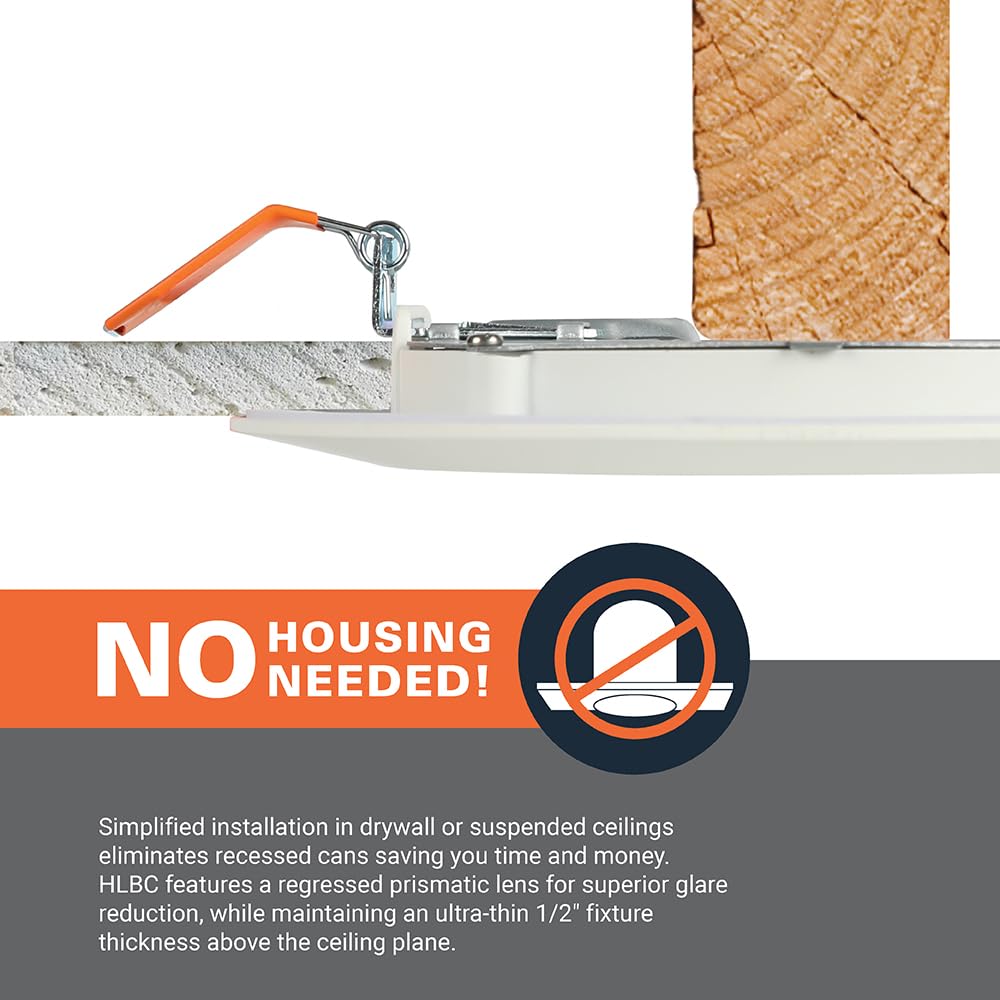 The Halo Hlbc Is A Slim Led Downlight Designed With Visual Comfort In Mind. It Features A Regressed Prismatic Lens For Superior Glare Reduction, While Maintaining An Ultra-Thin 1/2 In. Fixture Thickness Above The Ceiling Plane. This Means The Halo Hlbc Can Be Installed Virtually Anywhere, Regardless Of Plenum Space. The Hlbc Is Perfect For New Construction, Remodel, Or Retrofit Jobs. During Installation, Select The Perfect Color Temperature For Your Space With 5 Color Temperatures Between Warm (2700K) To Daylight (5000K) Or Dim-To-Warm Option. The Dim-To-Warm Setting Begins At 3000K And Dims Smoothly To 1800K, Creating A Rich, Warm Glow Resembling Candlelight Or The Sun On The Horizon. The Halo Hlbc Is An Ideal Solution For Residential And Light Commercial Applications Where Visual Comfort And Installation Flexibility Are A Priority.