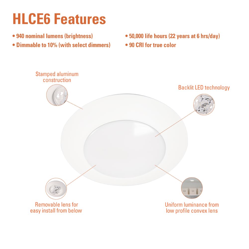 Halo Hlce 6 Inch Integrated Led Recessed Disk Light, 3000K, 900 Lumens, 90 Cri, Title 20 California Compliant, 6-Pack