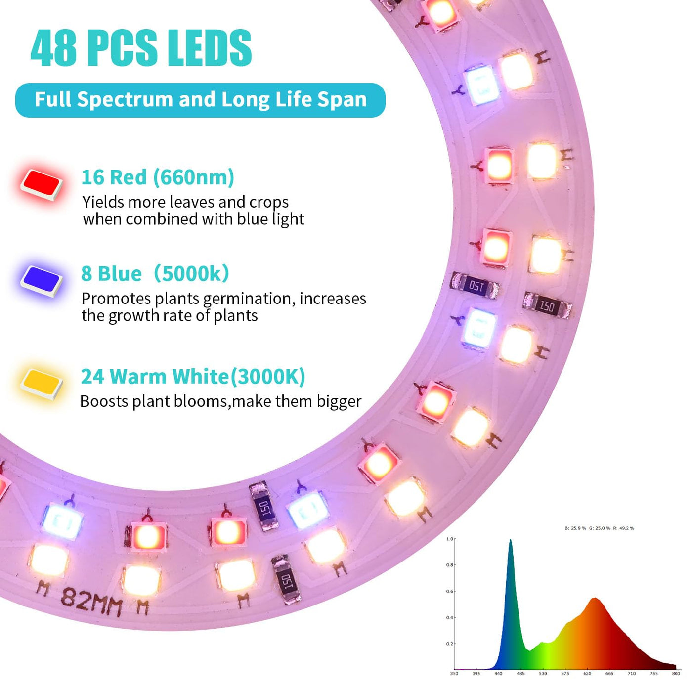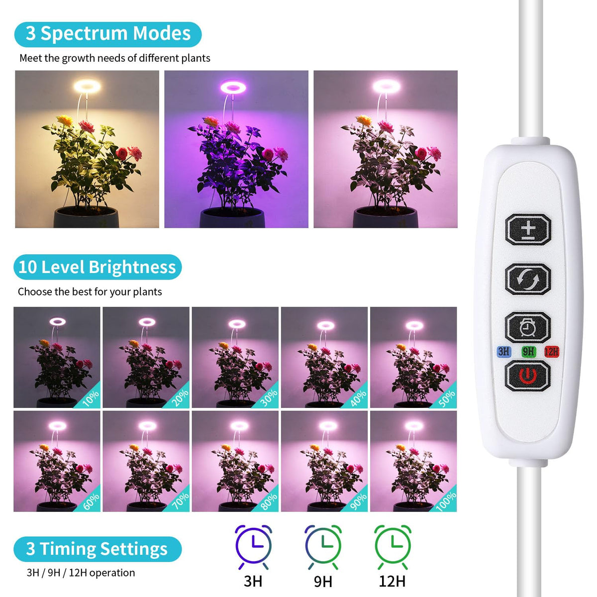 10 Dimmable Levels & 3 Spectral Modes: Customize the light intensity with 10 levels of brightness and select from 3 different spectral modes. The combination of red and blue light enhances flowering, fruit, and leaf growth, while warm light supports vegetative growth. The full-spectrum lighting mimics sunlight, ensuring comprehensive support for your plants at all growth stages.