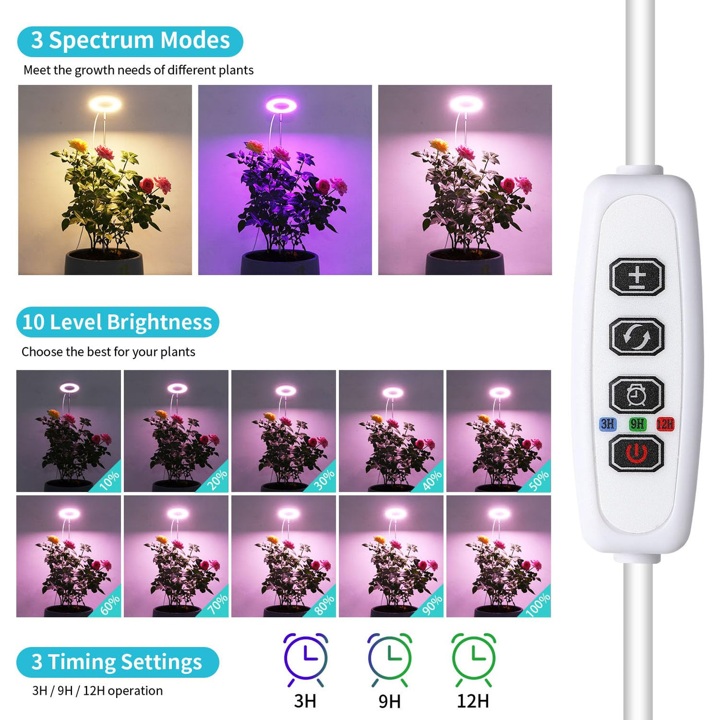 Auto On/Off & 3/9/12H Timing: Equipped with a cycle memory timer function, these grow lights can automatically turn on and off based on your preferred settings. Choose from 3, 9, or 12-hour cycles, allowing you to care for your plants effortlessly, even while at work or on vacation.