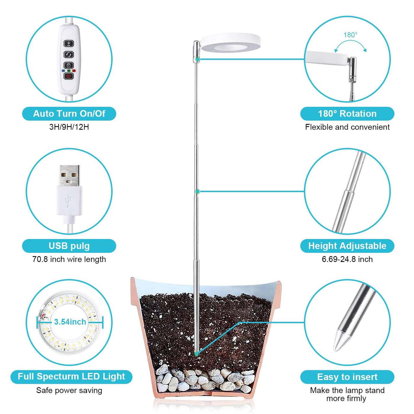 Halo Ring Grow Lights For Small Indoor Plants, Warm+White 96Leds Full Spectrum Plant Light, Height Adjustable With 5V 2A Adapter, 3/9/12H Timer, 3 Spectral Modes, 10 Dimmable Levels, Angel Ring 2 Pack