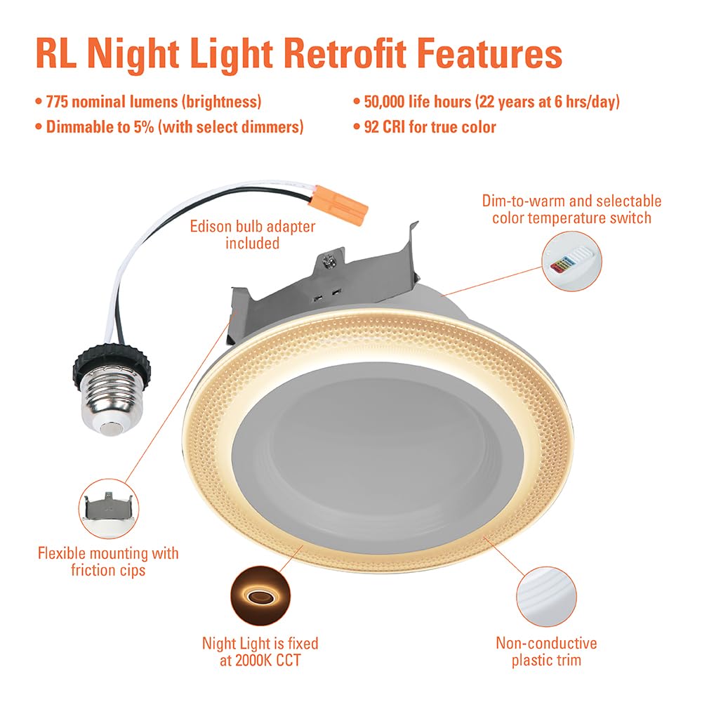 Halo Rl Night Light 4 Inch Recessed Led Trim, Retrofit Module 700 Lumens, Selectable Cct 2700K, 3000K, 3500K, 4000K, 5000K With