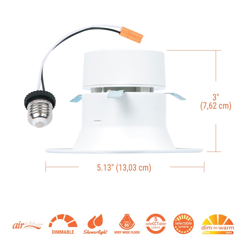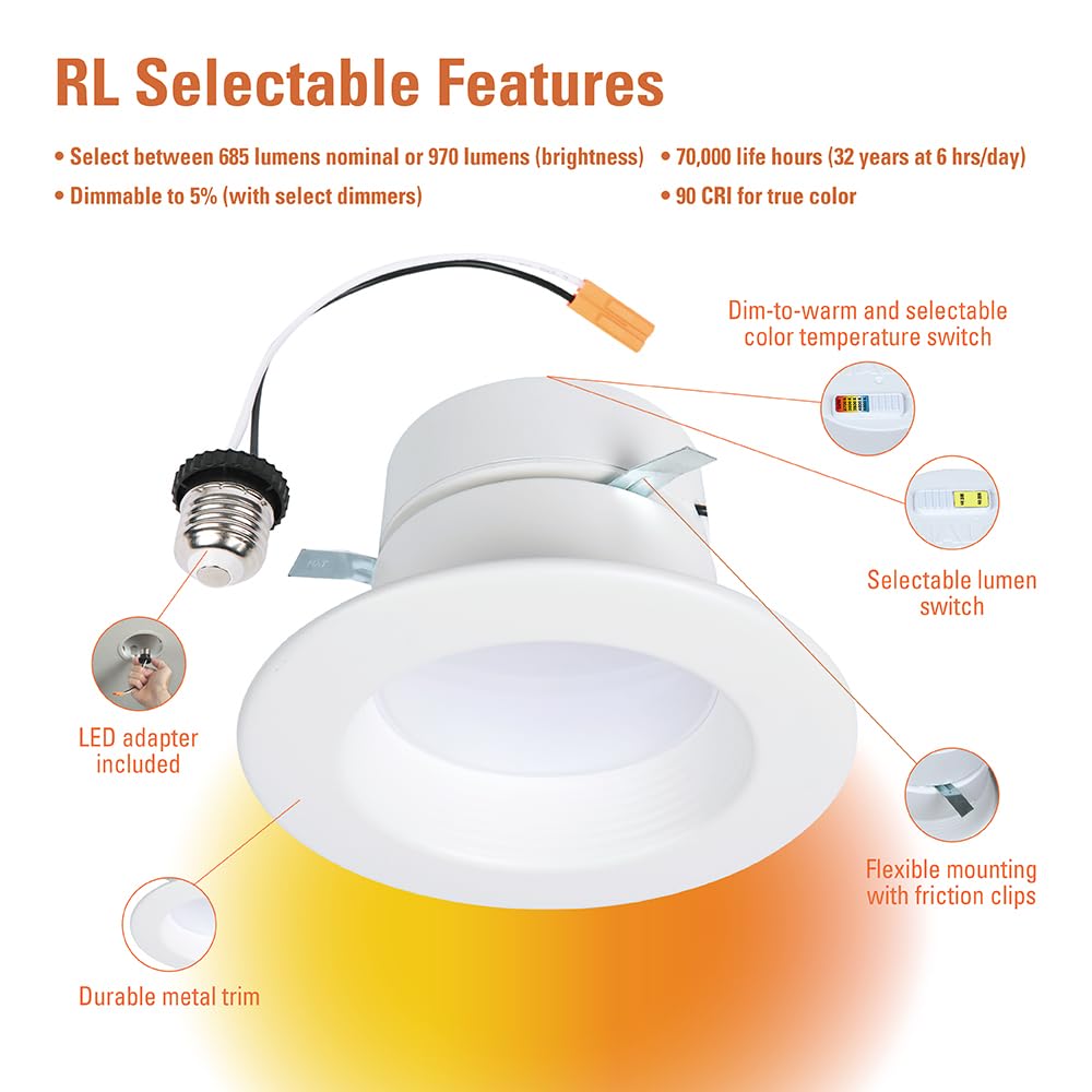 The Rl4 Is A 4 In. Aperture Recessed Led Baffle Trim Retrofit Module Suitable For New Construction, Remodel And Retrofit Installation. This Product Is Perfect For Residential Applications And Easily Installs In Existing 4 In. Housings. The Field-Selectable Color Temperature Switch Allows Users To Chose Between 6 Different Color Temperatures For The Desired Application Need. Choose From 2700K Warm Light To 5000K Cool Light Or Set The Mood Using The Dim-To-Warm Option. The Selectable Lumen Switch Allows Users To Select Their Desired Brightness. The Rl Series Is Air-Tite, Wet Location Listed And Perfect For Virtually All Residential Applications.