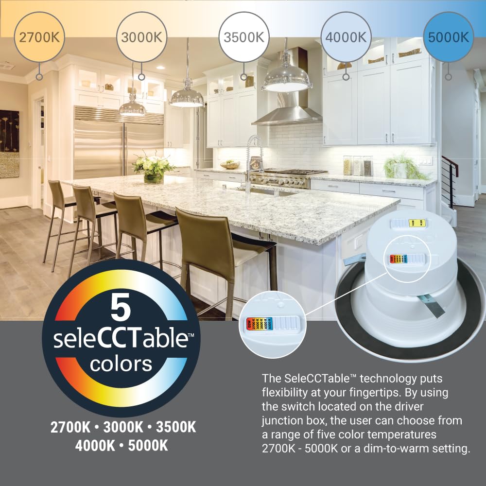 Q: What are the different color temperature options available for the HALO RL Series LED Retrofit Light?A: The HALO RL Series LED Retrofit Light offers six selectable color temperature options: dim-to-warm, 2700K, 3000K, 3500K, 4000K, and 5000K. This flexibility allows you to choose the perfect lighting for any mood or setting.