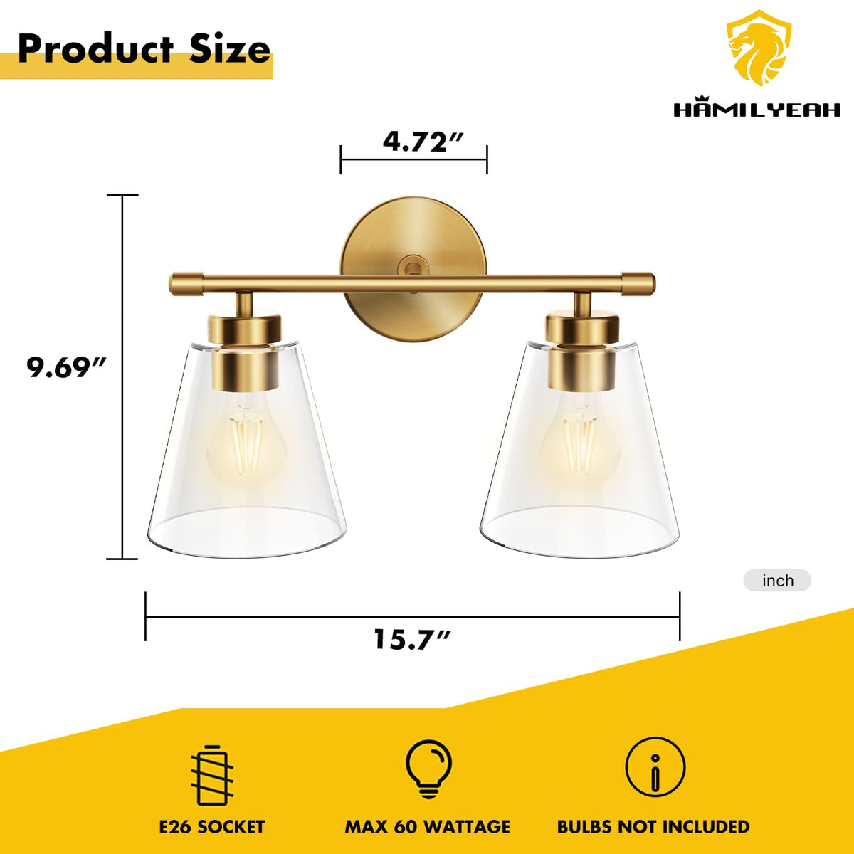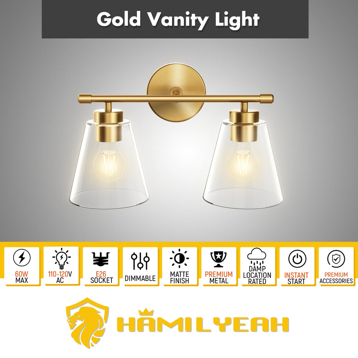 Hamilyeah concentrates in producing high quality light fixtures to delight and add love and warm to your home. We dedicated to provide professional sale service and make you enjoy lighting and shop with confidence! Product Dimension L*W*H 14.5'' X 9.44'' X 6.18'' Color Gold+Clear Glass Material Premium Metal with anti-rust coating + electroplating metal + hand blown thickened tempered transparent glass shade Location Dry and damp location Indoor Use Only Dimmable These light fixtures are dimmable when dimmable bulbs and dimmers are used Pack Level 2 pack Feature Modern and industrial look are compatible for most home and commercial places Warranty 1 year hassle free warranty.