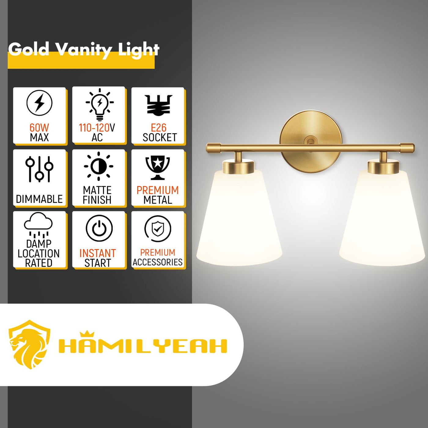 Q: Can this vanity light fixture be used in damp locations like bathrooms?A: Yes, the Hamilyeah Gold Bathroom Vanity Light Fixture is built with durable materials and has a detailed powder coating that enhances its waterproof function, making it suitable for use in moisture-damp locations such as bathrooms.