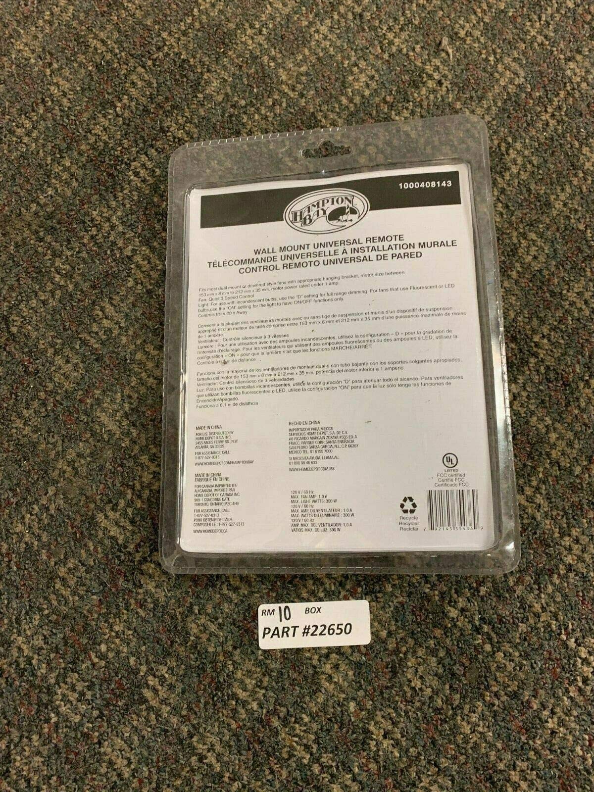 Q: How do I install the Hampton Bay Universal Wall-Mount Remote?A: Installation can be done wirelessly or through direct wiring, following the included instructions for either method to ensure proper functionality.