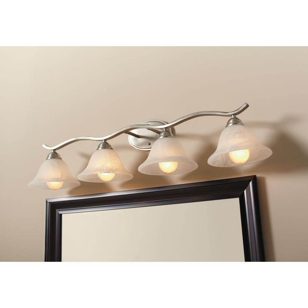 Q: What type of bulbs does the Hampton Bay 4-light brushed nickel bath vanity use?A: The Hampton Bay 4-light brushed nickel bath vanity typically uses standard medium base bulbs, providing flexibility to choose between LED, incandescent, or CFL options.