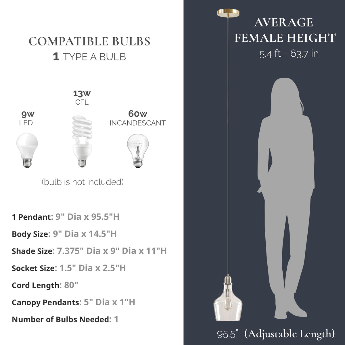 Q: What is the size of the Hampton Hill Auburn Pendant Light?A: The pendant light has a size of 9 inches in diameter and a height of 95.5 inches, with an adjustable black cord, making it suitable for different room settings.
