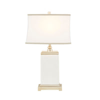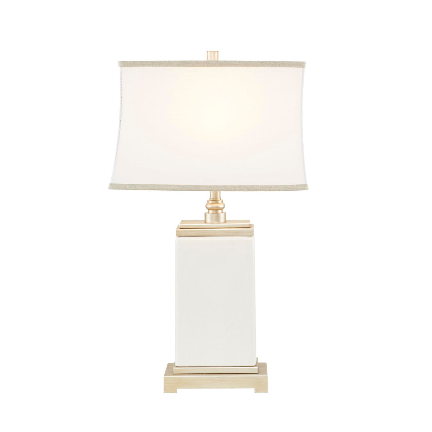 Q: What materials are used in the construction of this table lamp?A: This table lamp features a base made of ivory ceramic and an antique silver metal accent, while the shade is crafted from off-white cotton with grey trim.