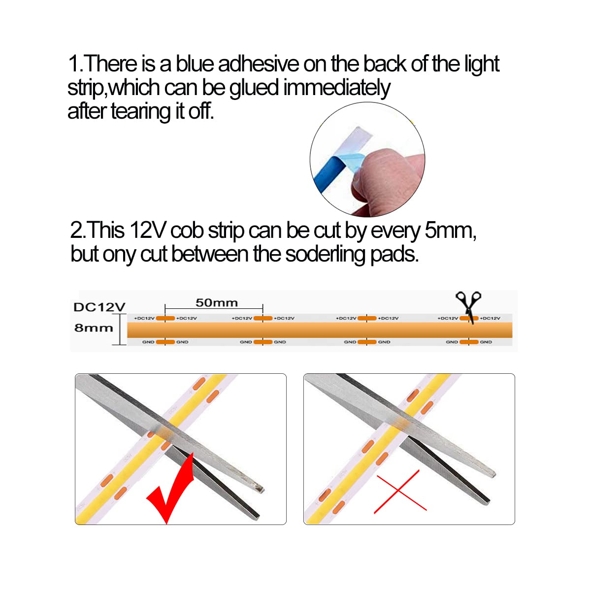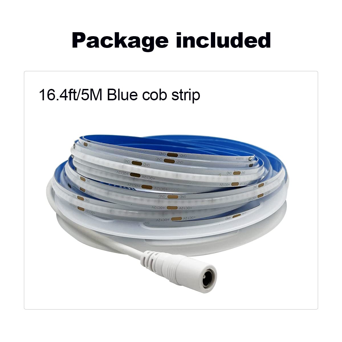Cob Led Strip Light Technology Is A New Step And Better Solution For Led Profile, You Can Customize Your Project, The Lightinng Is Very Smoothly.It'S Quite Simple To Install, Red Wire To Red Positive; Black Wire To Ground. Pay Attention To The Surfaces By Double-Side Tape For Led Strip.Such As Glass; Metal; And The Plastic Surface Can Affect Their Function And Durability. Please Test The Adhesion Of The Light Bar Before Installation.Description:1. Light Source: Cob Led Strip 320Leds/M,1600Leds/5M2. Power: 8W/ Meter,40W/5M3. Emitting Color:Blue4. Viewing Angle: 180 Degrees5. Operating Temperature: -25 ~ +60 &Deg;C6. Storage Temperature: -40 ~ +80 &Deg;C7. Voltage: Dc 12V8. Double White Pcb Board9. Non-Waterproof Cob Led Strip10.Packing: 5 Meter/ 16.4Ftapplications: The Cob Strip Lights Is Safe For Daily Use, Especially For Children And Pets, Ideal For Under Cabinet Lighting, Desk Lighting;Architectural Decorative Lighting; Indoor Home Decoration Lighting; Auditorium Walkway Lighting; Stairway &Amp; Decoration Lighting; Border/ Contour Lighting; Channel Letter Lighting;Tv Lights Behind: Emergency &Amp; Security Lighting; Cove Lighting; Shop-Window Decoration.&Quot;