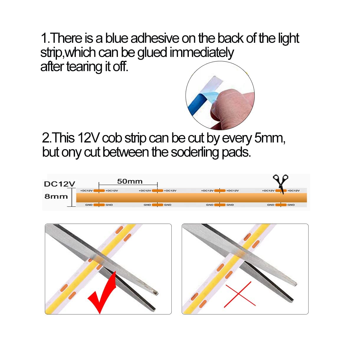 Q: How do I install the COB LED Strip Lights?A: Installation of the COB LED Strip Lights is simple. Connect the red wire to the red positive terminal and the black wire to the ground. Ensure to use double-sided tape on suitable surfaces like glass, metal, or plastic for optimal adhesion.