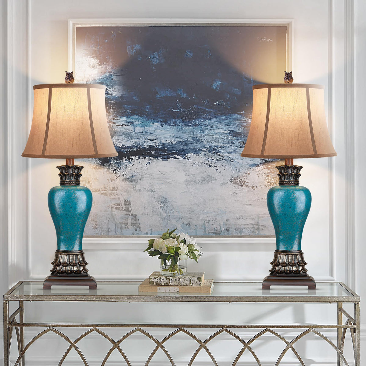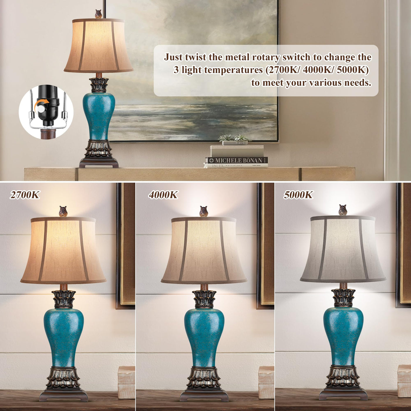 Hamucd 29'' Set Of 2 Farmhouse Rustic Table Lamps For Living Room,3-Color Temperature Dimmable Blue Southwest Bedroom Lamps For