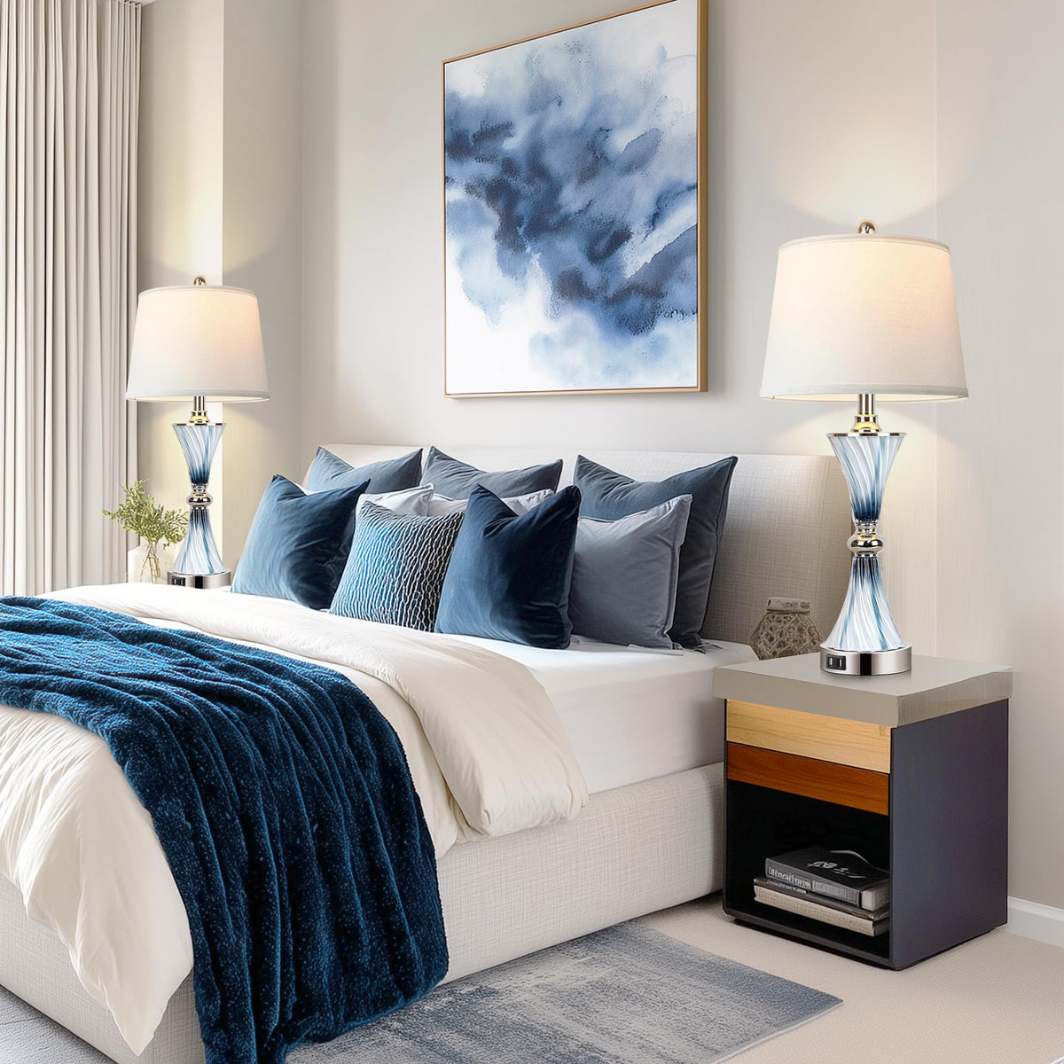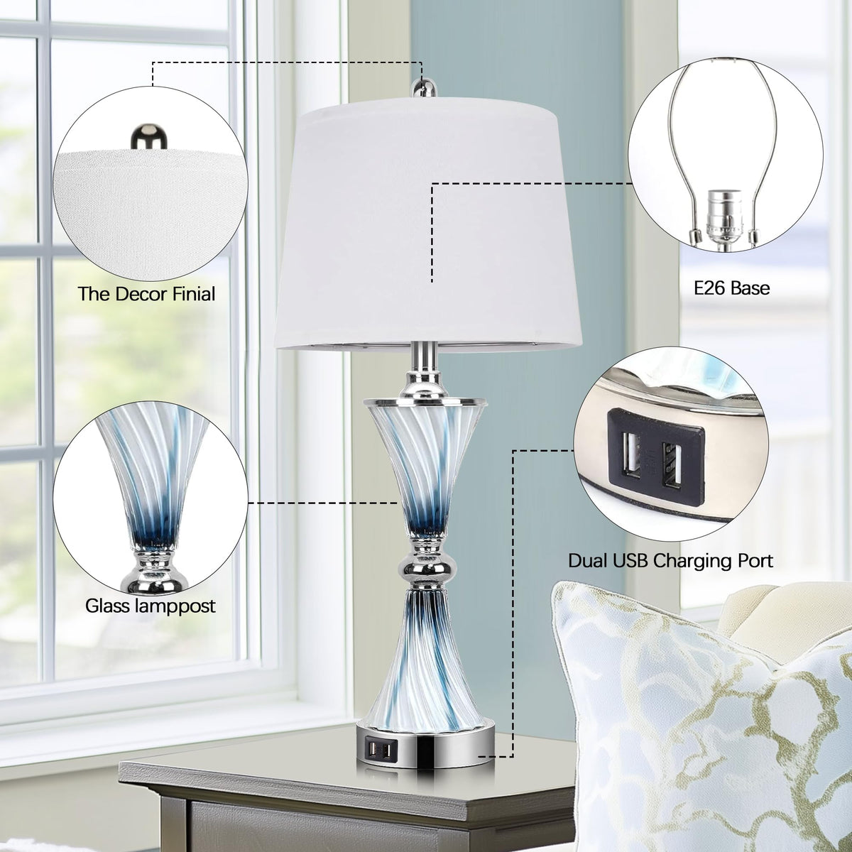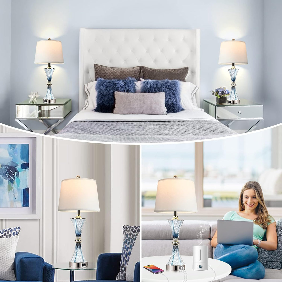 Hamucd 3-Way Dimmable Touch Glass Table Lamps For Bedrooms With 2 Usb Ports Set Of 2 Coastal Beach Bedside Lamps For Contemporary Modern Night Stand Lamps With 2 Led Bulbs For Lighting Decor