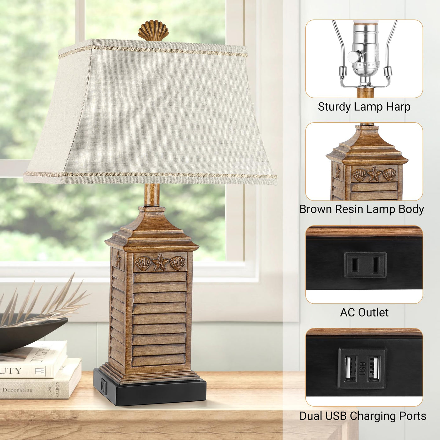 Hamucd Coastal Table Lamps Set Of 2 With Usb Ports & Ac Outlet - Brown Nautical Nightstand Decor
