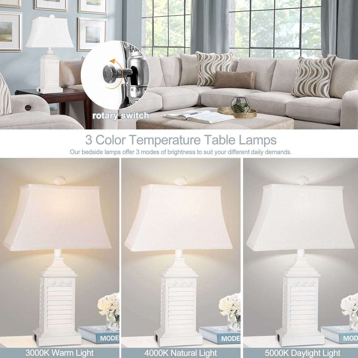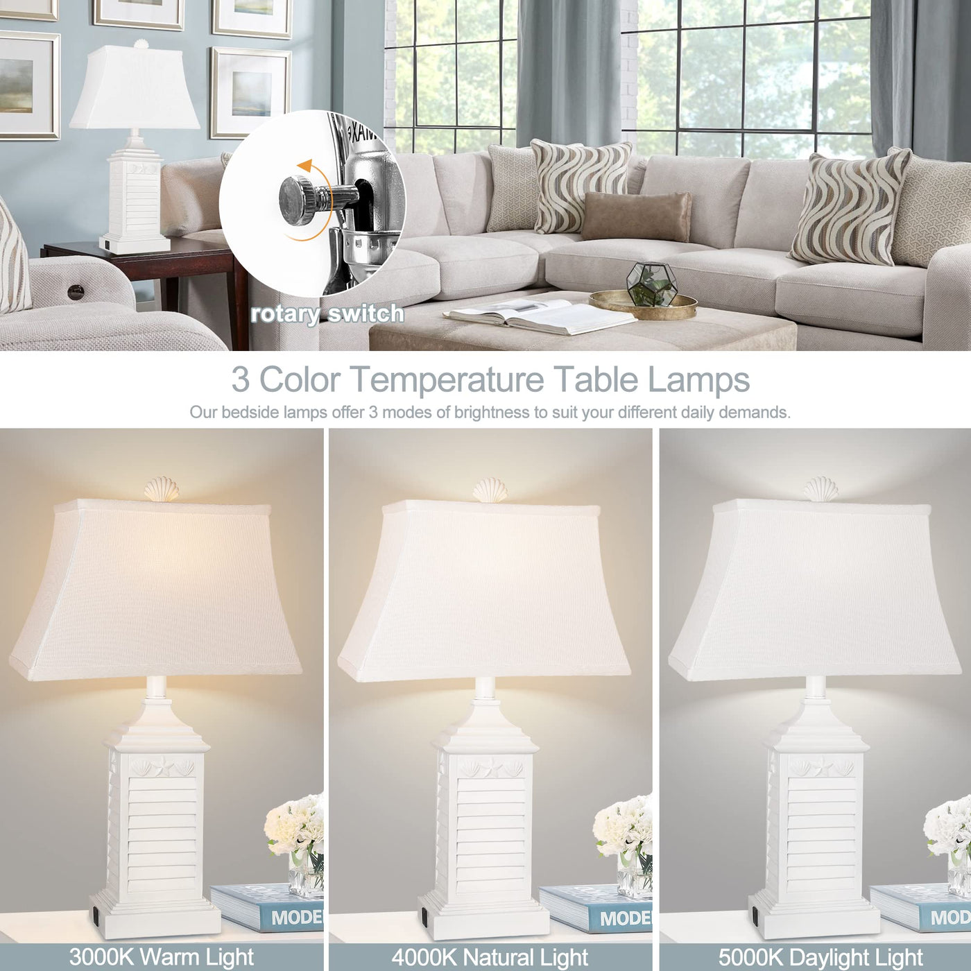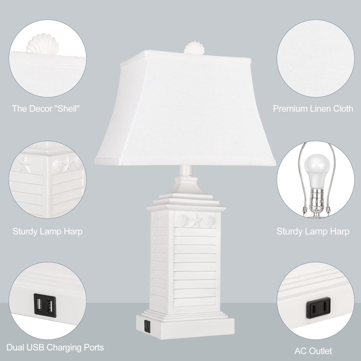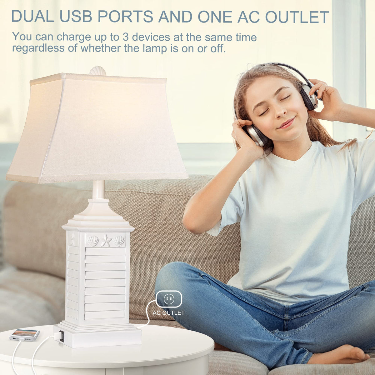 Hamucd Coastal White Table Lamps Set Of 2 With Usb Ports & Ac Outlet, Modern Resin Nightstand Lamps