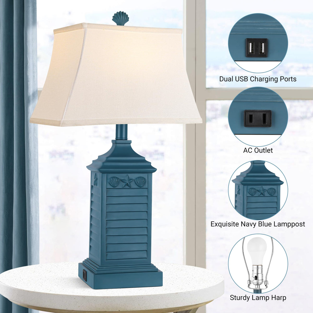 - **Coastal Nautical Design**: Featuring a striking navy blue resin cuboid body adorned with a delicate seashell pattern, these table lamps serve as a unique and charming accent piece. The white fine linen lampshade diffuses light softly, creating a cozy atmosphere in your home.