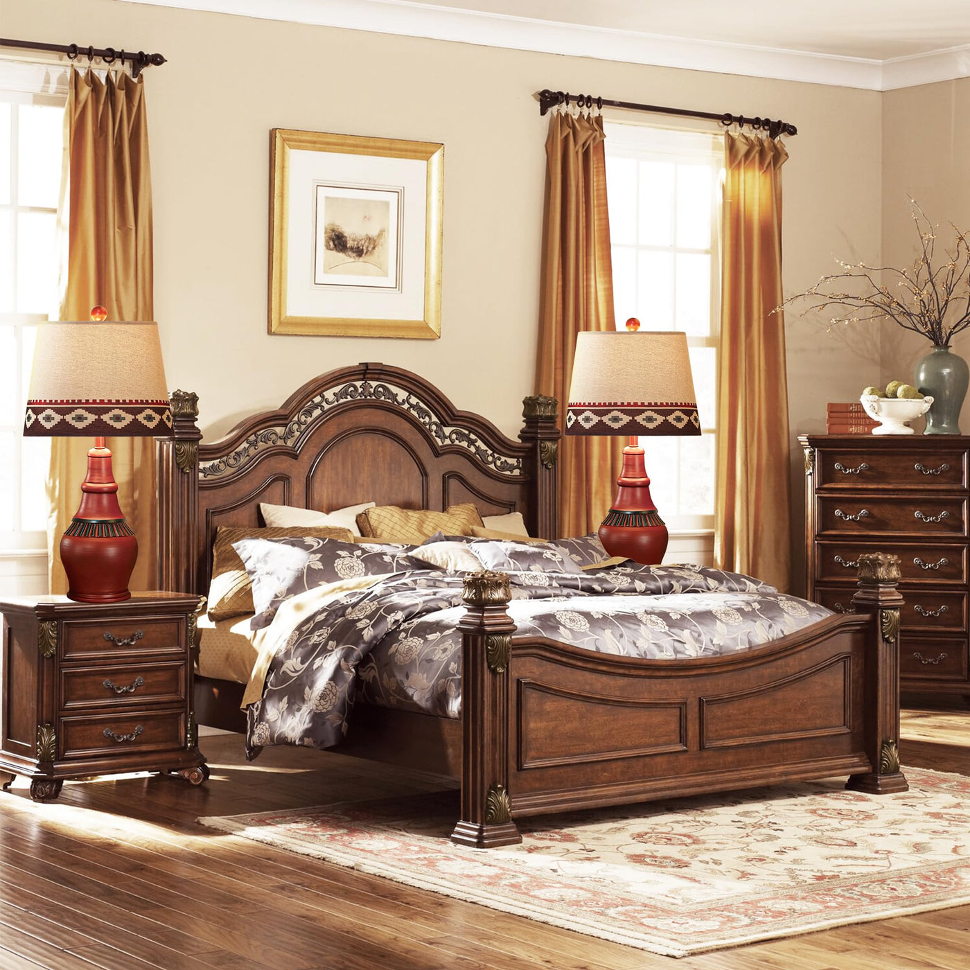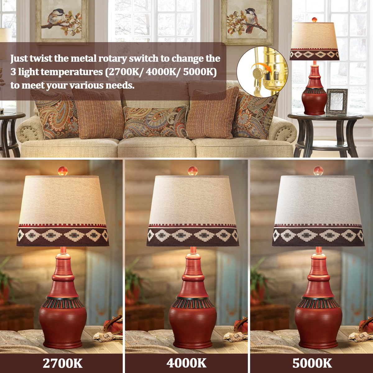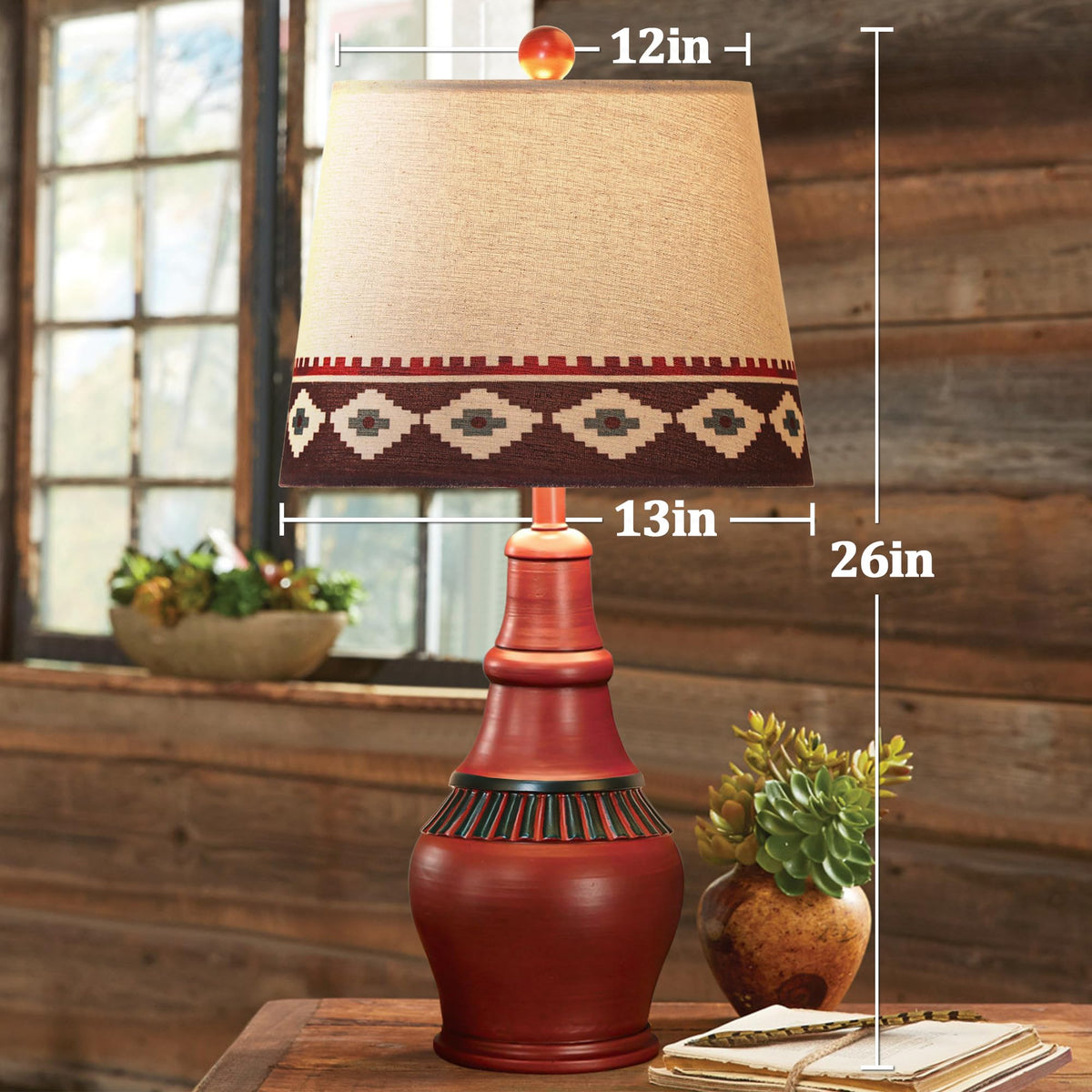 Q: What type of decor style do these lamps complement?A: These rustic table lamps are designed with a Southwest farmhouse style, featuring vibrant red tones and unique geometric patterns, making them a perfect addition to rustic, bohemian, or southwestern-themed home decor.