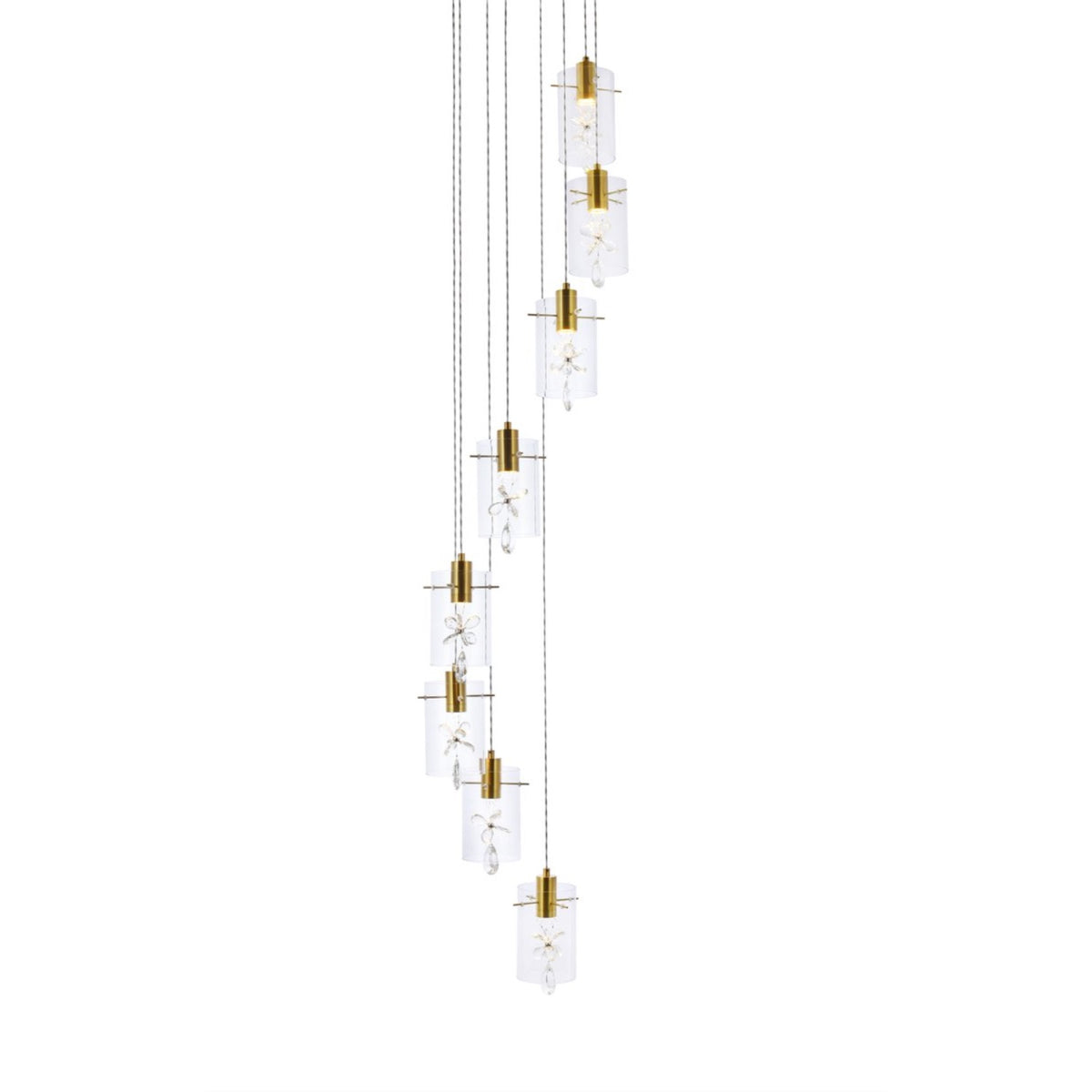The Hana collection sparkles with an extraordinary display of faceted crystal pendalogues, creating the illusion of a shimmering cascade of ornamentation pouring from a sleek metal canopy. These fixtures would be a commanding visual presence in any room, and will fit comfortably in smaller spaces. Lighting illuminated with led diodes emitting 3000K soft white.