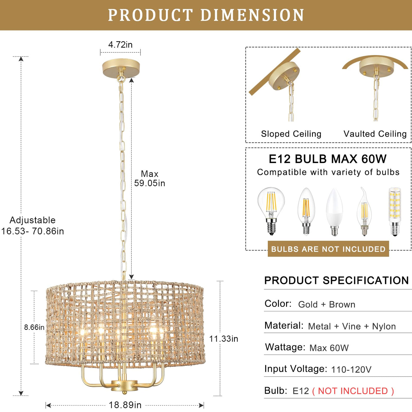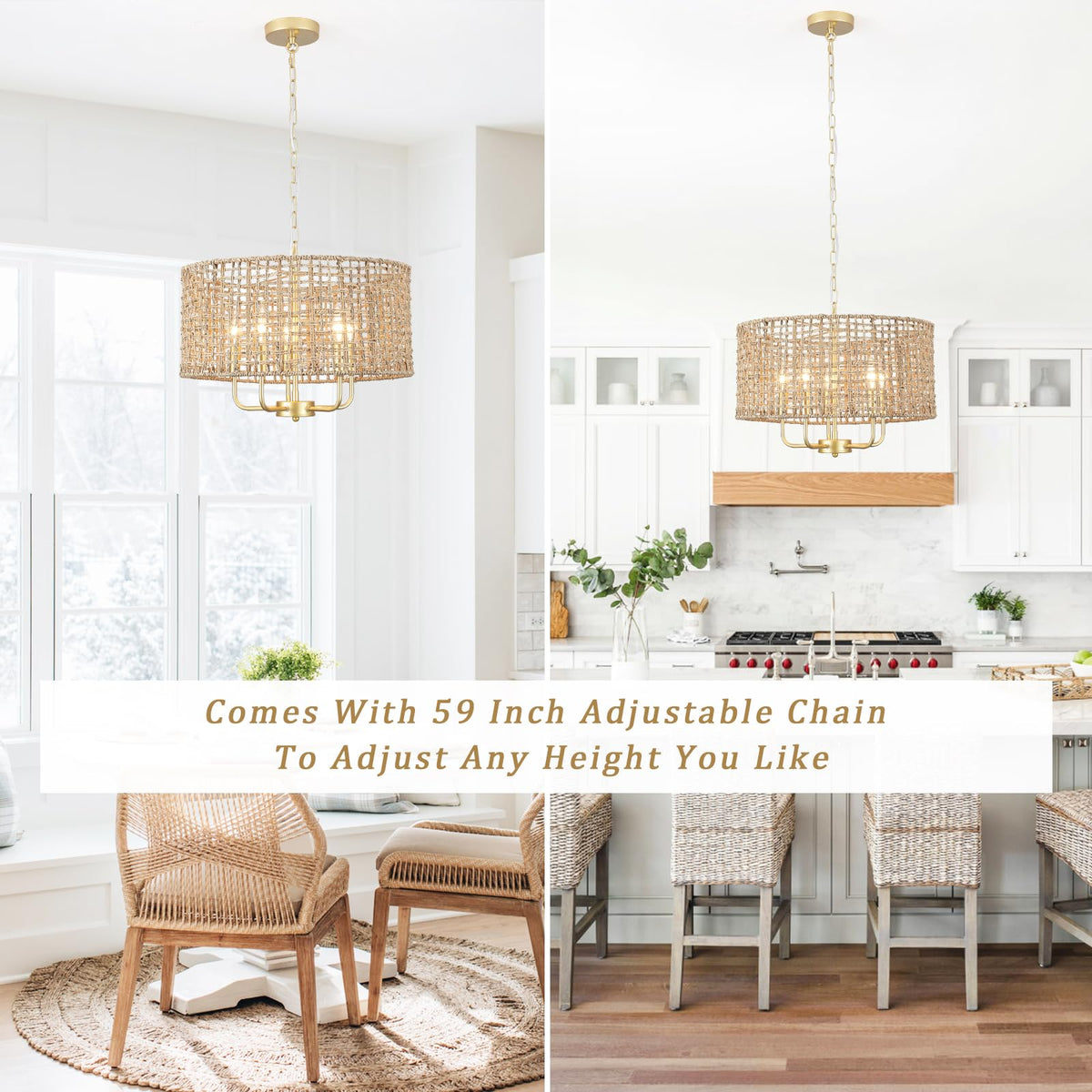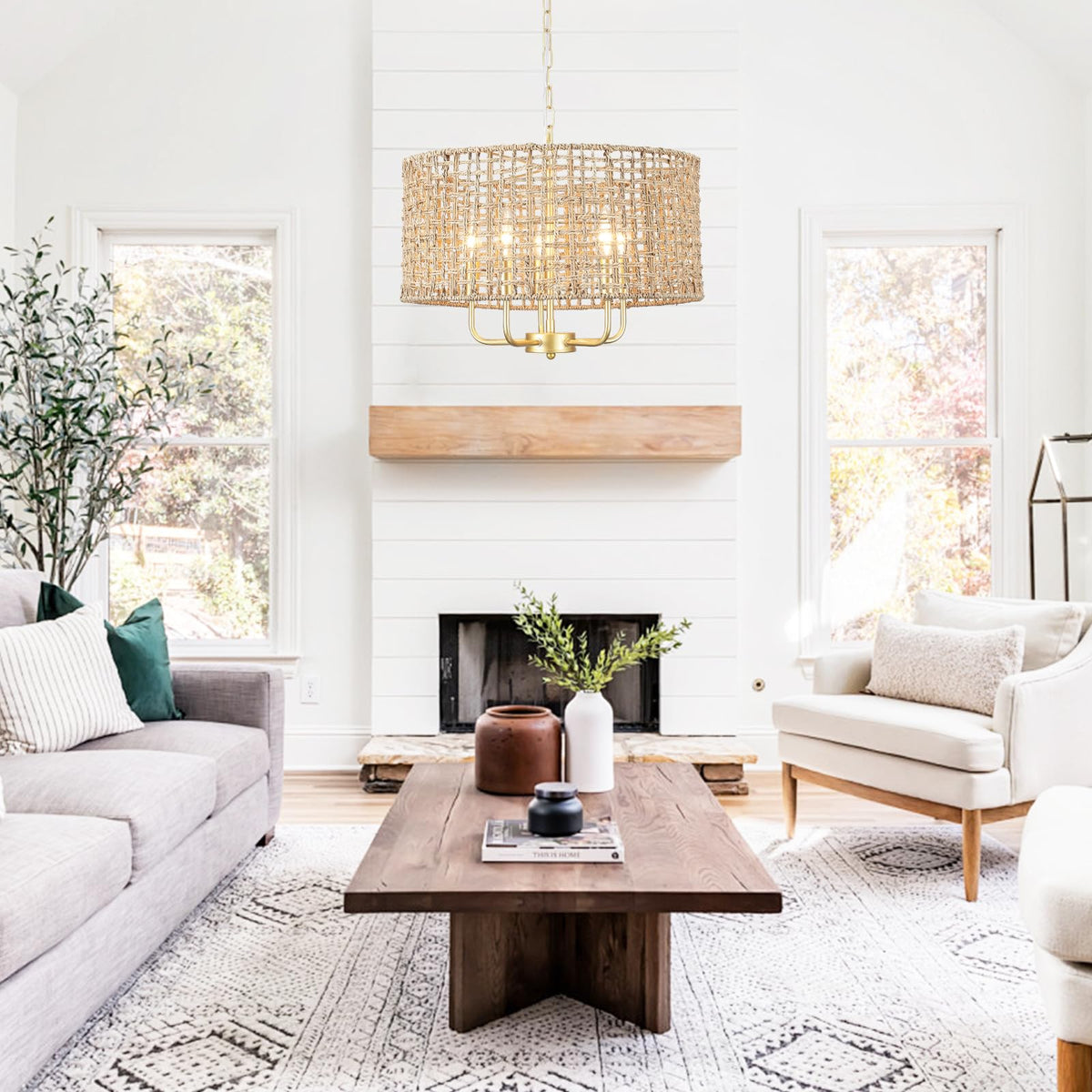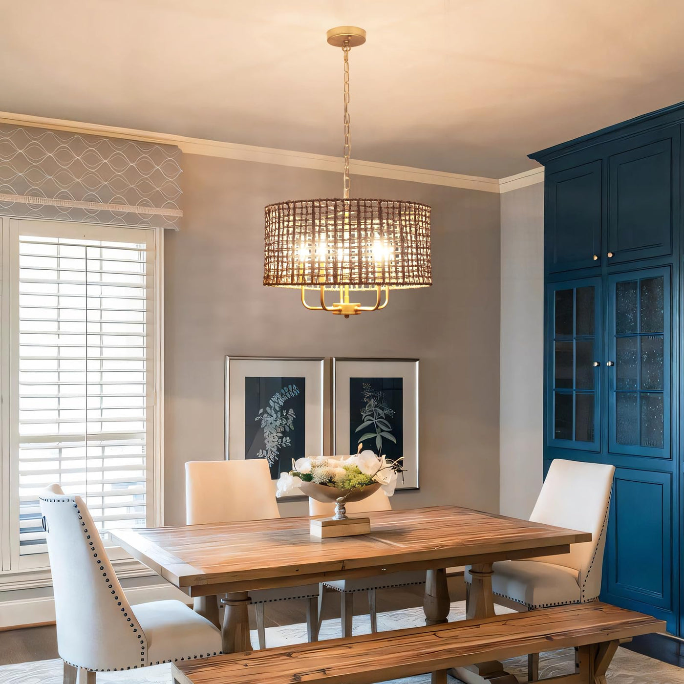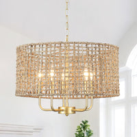 Transform your living space with this stunning hand-woven rattan chandelier that perfectly blends rustic charm with modern elegance. The intricate wicker shade creates a mesmerizing pattern of light and shadow when illuminated by the five interior lights, adding warmth and character to any room. The gold-finished frame and chain suspension system provide a luxurious accent that complements both contemporary and farmhouse-style decor. This drum-style chandelier makes a striking statement piece in dining rooms, kitchens, living areas, foyers, or entryways. The natural texture of the woven shade adds an organic, bohemian touch while maintaining sophisticated appeal. The fixture's thoughtful design allows for ample illumination while creating an ambient atmosphere. Installation-ready with all necessary hardware, this chandelier brings the perfect balance of form and function to elevate your home's lighting design. For optimal lighting effect and visual impact, consider installing this fixture with a dimmer switch to adjust the ambiance according to your needs.