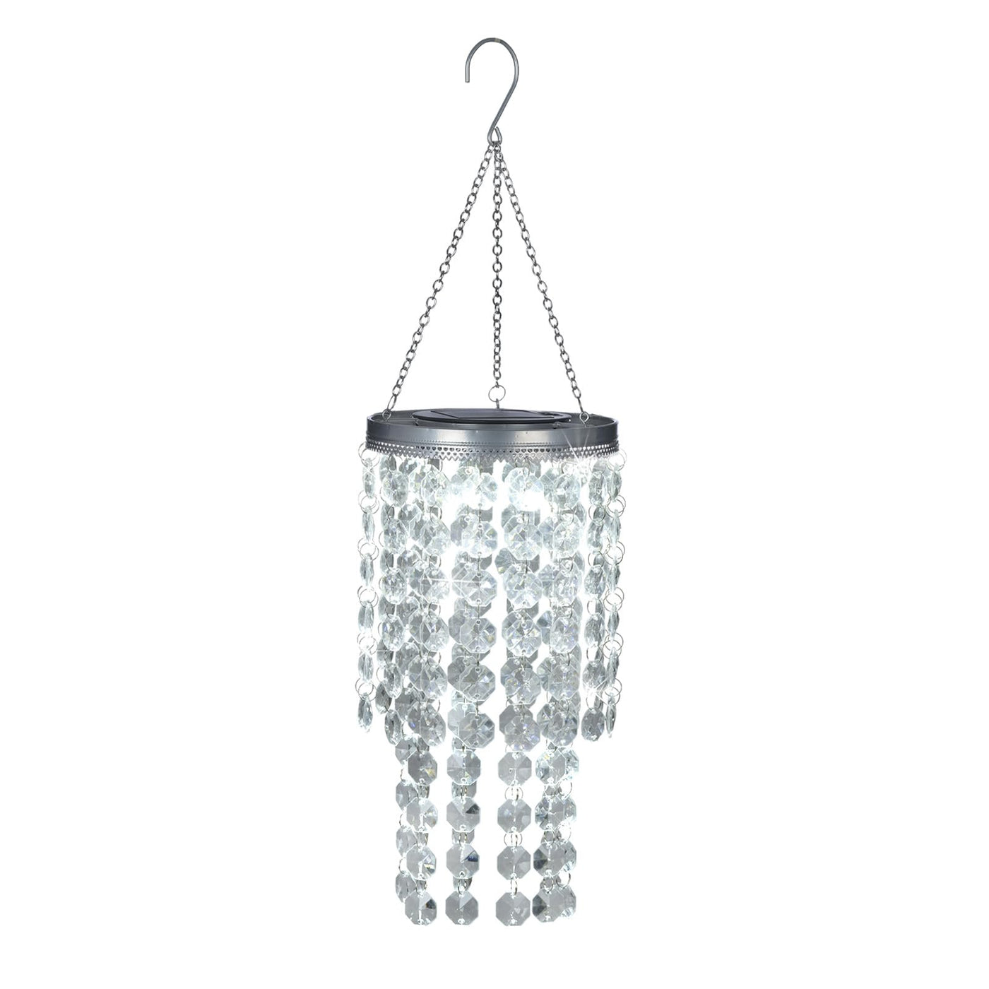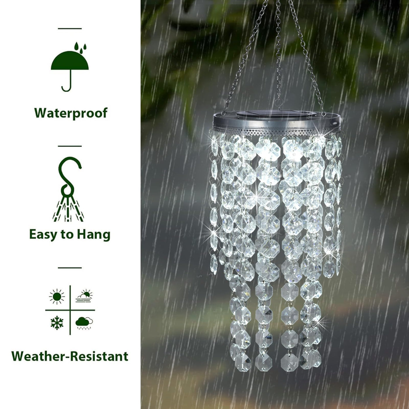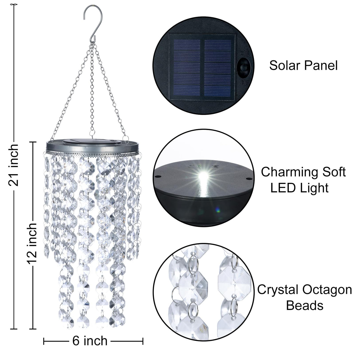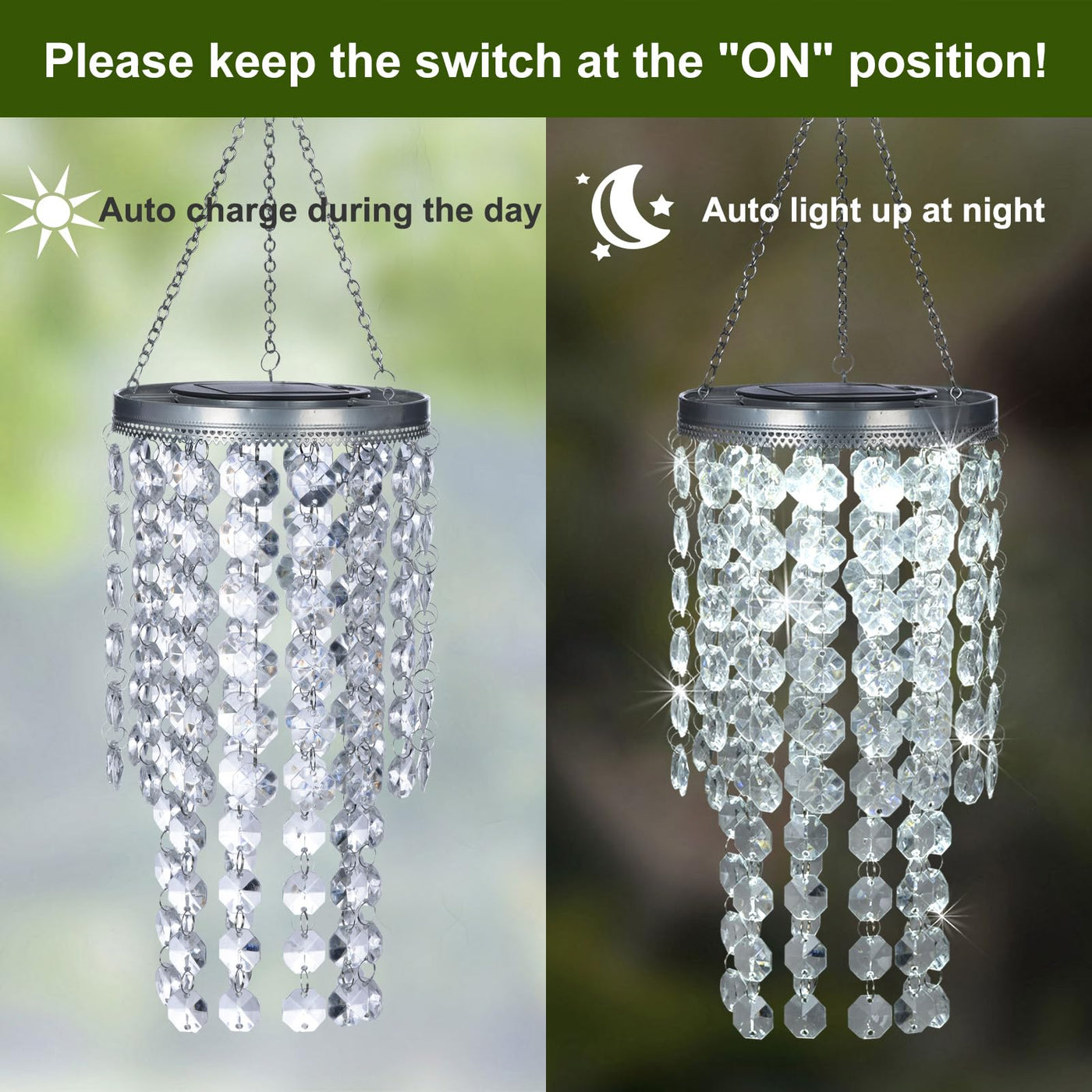 Artful framework of black metal supports strings of transparent simulated crystals and forms 2 dramatic tiers. These clear acrylic beads catch the light of LEDs, making it dance on the ceiling. Dispel the darkness and cast away the gloom with them. This solar-powered beaded chandelier provides cordless illumination over a patio or deck. And one waterproof solar panel sits bottom of the unit. It absorbs the sunshine during the day, then automatically emits cool white light at dusk. Acrylic beads can resist elements. Each bead is connected by metal ring, don't worry about breaking. Metal frame makes it sturdy, not easy to deform. Plus, no assembly required, simply hang in a sunny spot and enjoy the glow all day. The total dimension of lantern is approx. 21 H x 6 W. Includes a 9 chain and hook for easy to hang it on patio; garden and porch to create a sparkly atmosphere. Decorate your day and brighten your night with our mini crystal wind chimes. This gorgeous fake chandelier is not only a lamp, but also an eye-catching decoration. This solar crystal lamp can be hung from branches; porch; gazebo, adding style and sparkle to your weddings and other festival events.