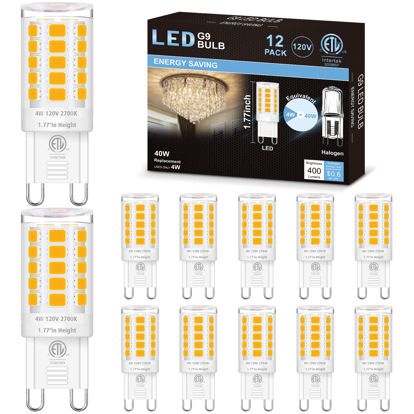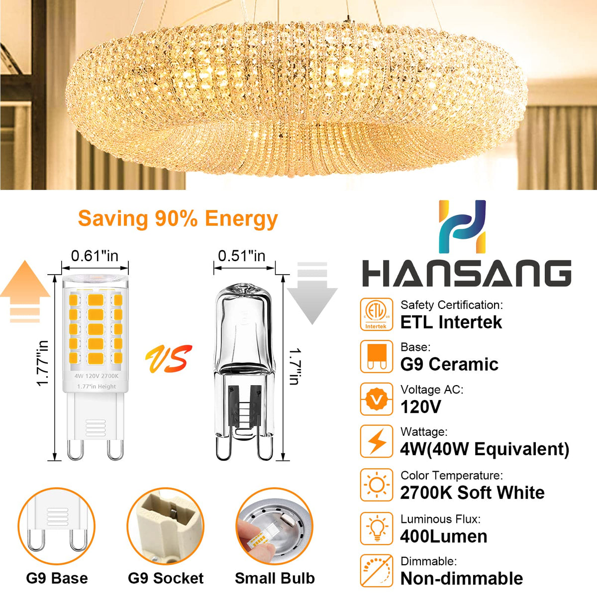 Featurethis 4W G9 Led Bulb Can Be Your Best Choice To Replace The 40W Traditional Halogen Bulbs. Energy-Saving Led Chip Provide Refreshing Bulbs Warm White And Save Your Electrical Bill.Fireproof Ceramic Material Ensures Better Heat Dissipation Effect And Offer Longer Lifespan.Standard Bi-Pin Solid Metal Plate Contact G9 Base. Perfect For Crystal Chandelier, Pendant, Etc.Zero Harsh Glares Prevents Eye Fatigue. No Uv Or Ir Radiation, No Visible Flicker, No Buzz Or Flash.Transparent Plastic Cover Allow The G9 Bulb To Provide 360-Degree Well-Balanced Illumination.Specificationtype: G9 Led Bulbcri: 85+Power: 4Wdimmable: Novoltage: Ac 120Vluminous Flux: 400Lmhalogens Equivalent: 40Wcolor: Warm White 2700Kmaterial: Plastic And Ceramicbeam Angle: 360-Degreelifespan: 30000 Hourshansang 24-Month After Sale Servicepackage: 12Psc 4W G9 Led Light Bulbs (2700K Soft Warm White)Warning1. The G9 Led Bulbs Are Non-Dimmable.2. Make Sure The Size Is Suitable Before Purchase.3. Please Turn Off The Power Before Installation.4. Keep Away From Any Source Of Heat Or Water.