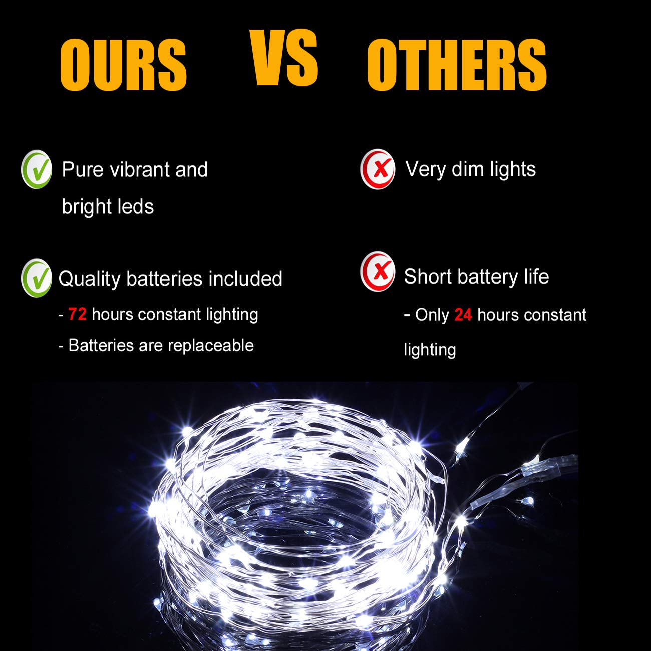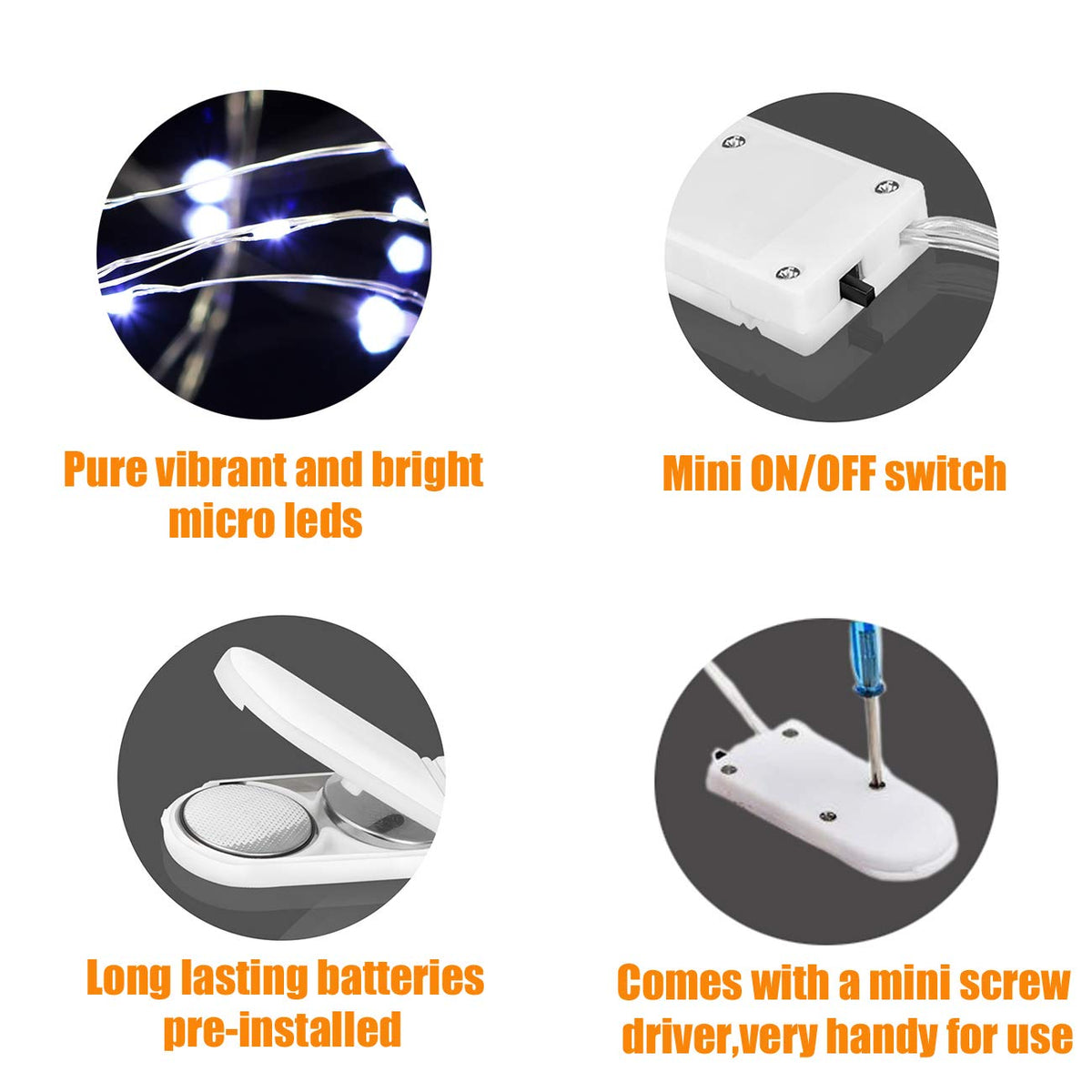 Easy to use -Each strand is made of real copper wire(silver coated,which is fexible,strong and sturdy,you can wrap it on your wreath,Christmas ,drop into mason jars or anything you like to decorate -These fairy lights give out a comfortable cool white light,great for ambience creation -The mini string lights applied ultra bright micro leds,shining,cute and long life