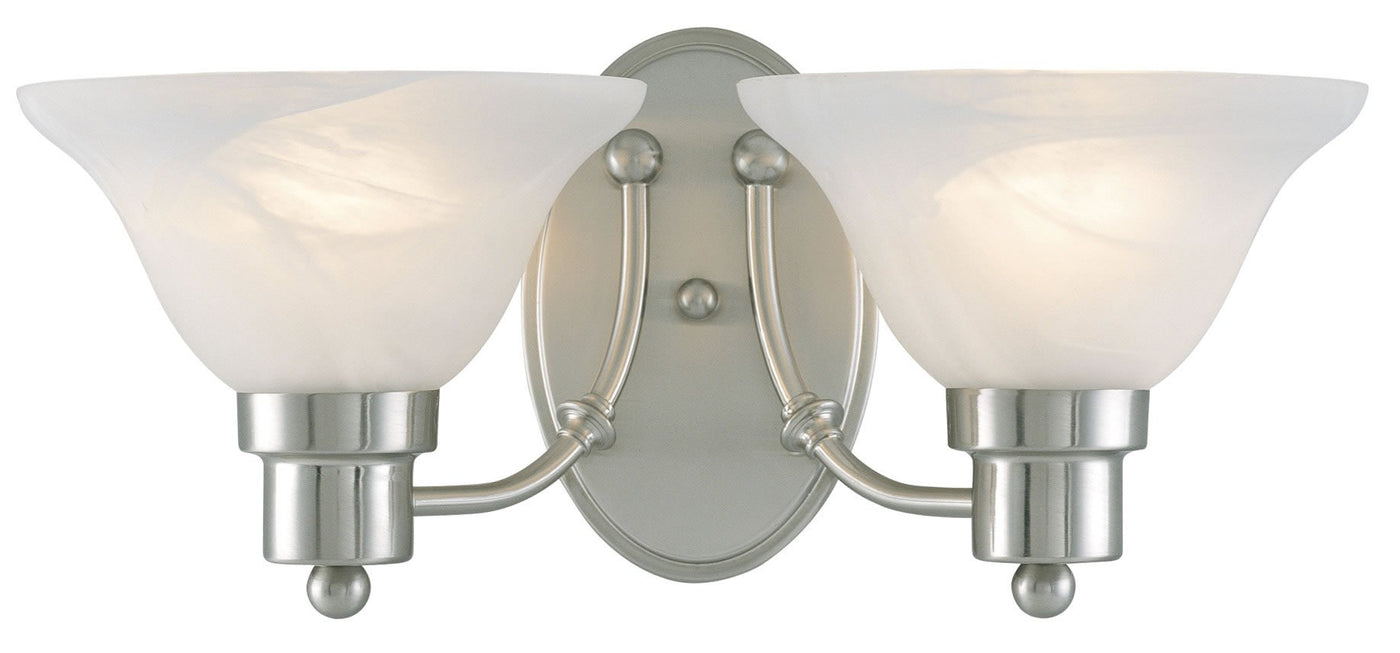 Constructed with a brushed nickel finish, the Bristol light fixture offers a contemporary look that complements its opaque alabaster glass. This combination not only adds aesthetic appeal but also produces a warm and inviting glow, making it ideal for creating a cozy atmosphere. The fixture measures 16 inches in length and 7-1/2 inches in height, projecting light 8-1/2 inches from its mounted position. It is designed to accommodate two 60-watt bulbs (not included), allowing for customizable brightness levels to suit your needs.