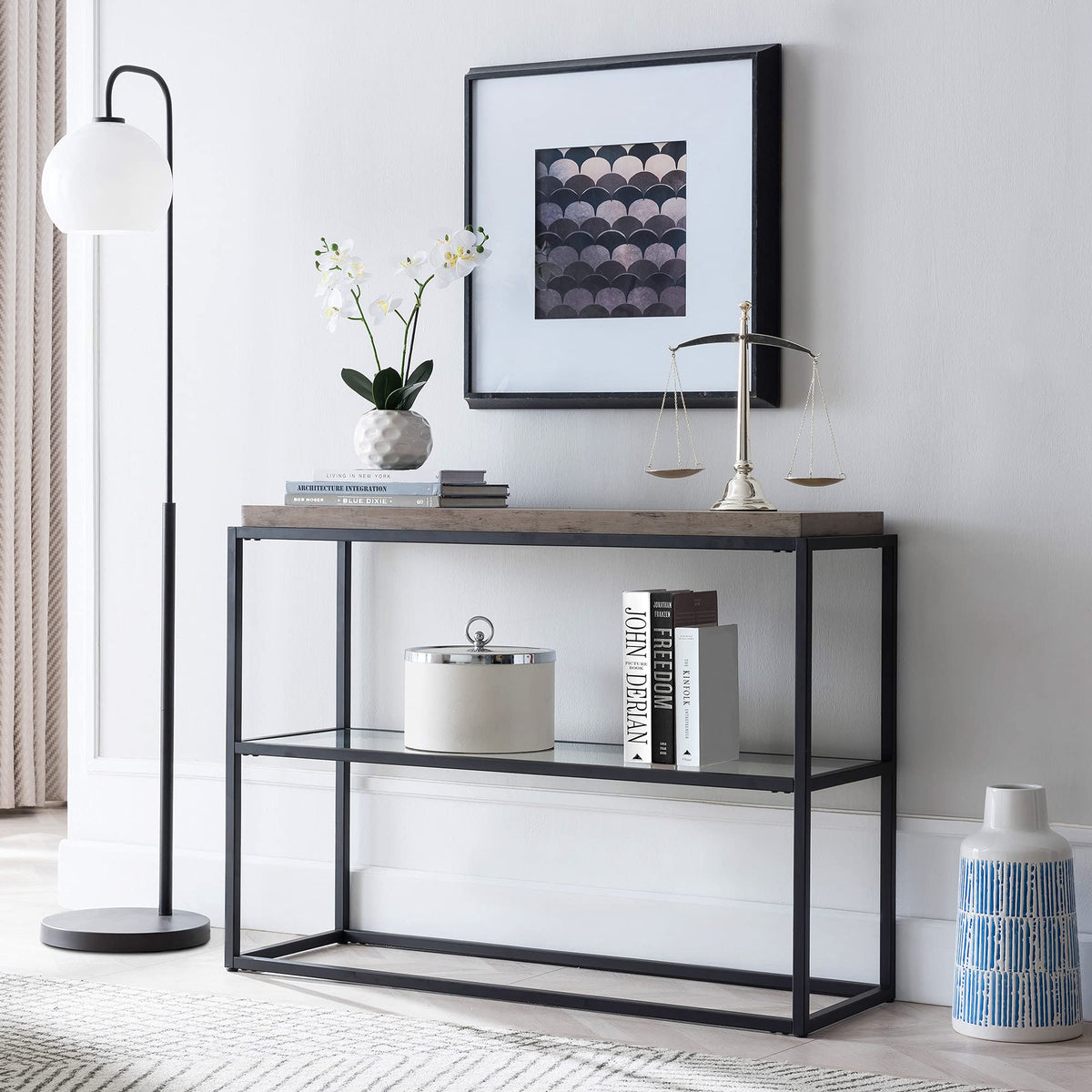 Q: What materials are used in the construction of this lamp?A: The base of the Harrison Arc Floor Lamp is made from blackened bronze metal, and it features a stylish glass globe-shaped shade that adds elegance to your home decor.