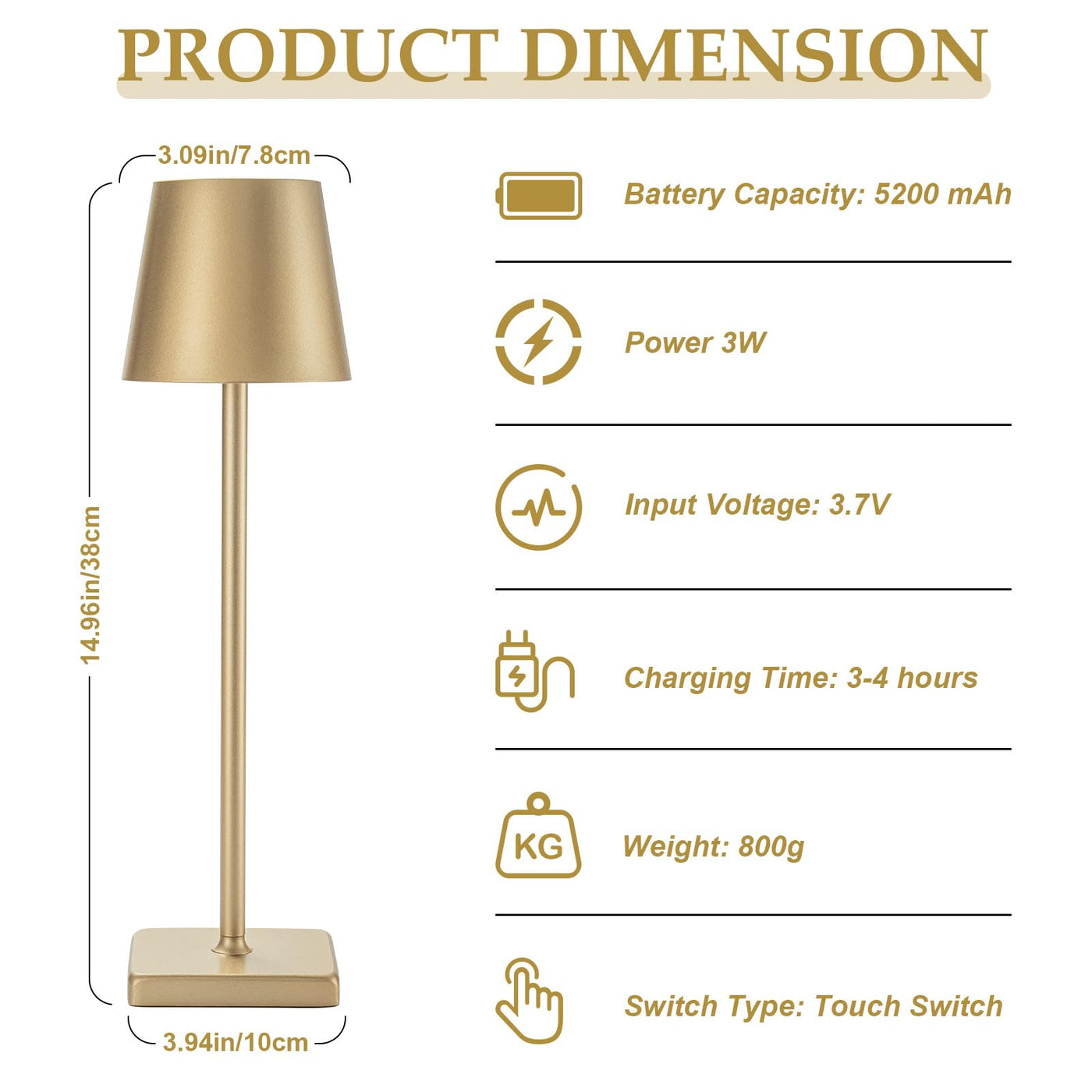 Hasun Gold Cordless Table Lamp, Aluminum Shell Led Rechargeable Desk Lamp, 3W 5200Mah Battery Operated Table Light, 3 Color Step