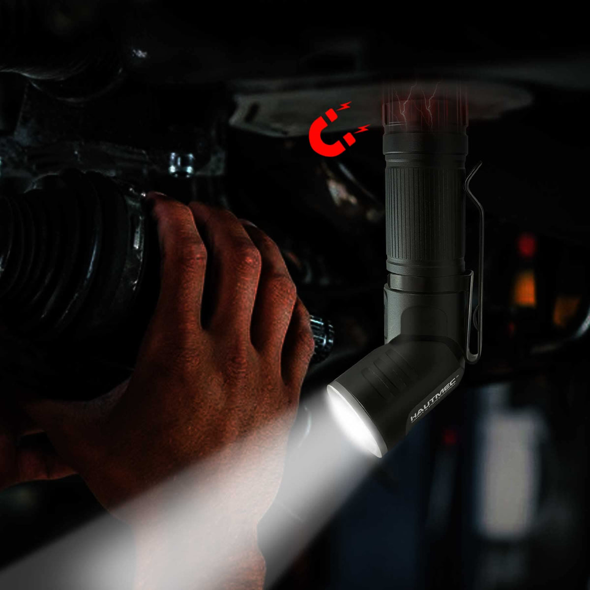 Q: Can the flashlight be used hands-free?A: Yes, the HAUTMEC flashlight features a strong magnetic base that allows it to be attached to any iron surface. This design, along with its 90° adjustable head, enables hands-free operation for tasks like car repairs or camping.