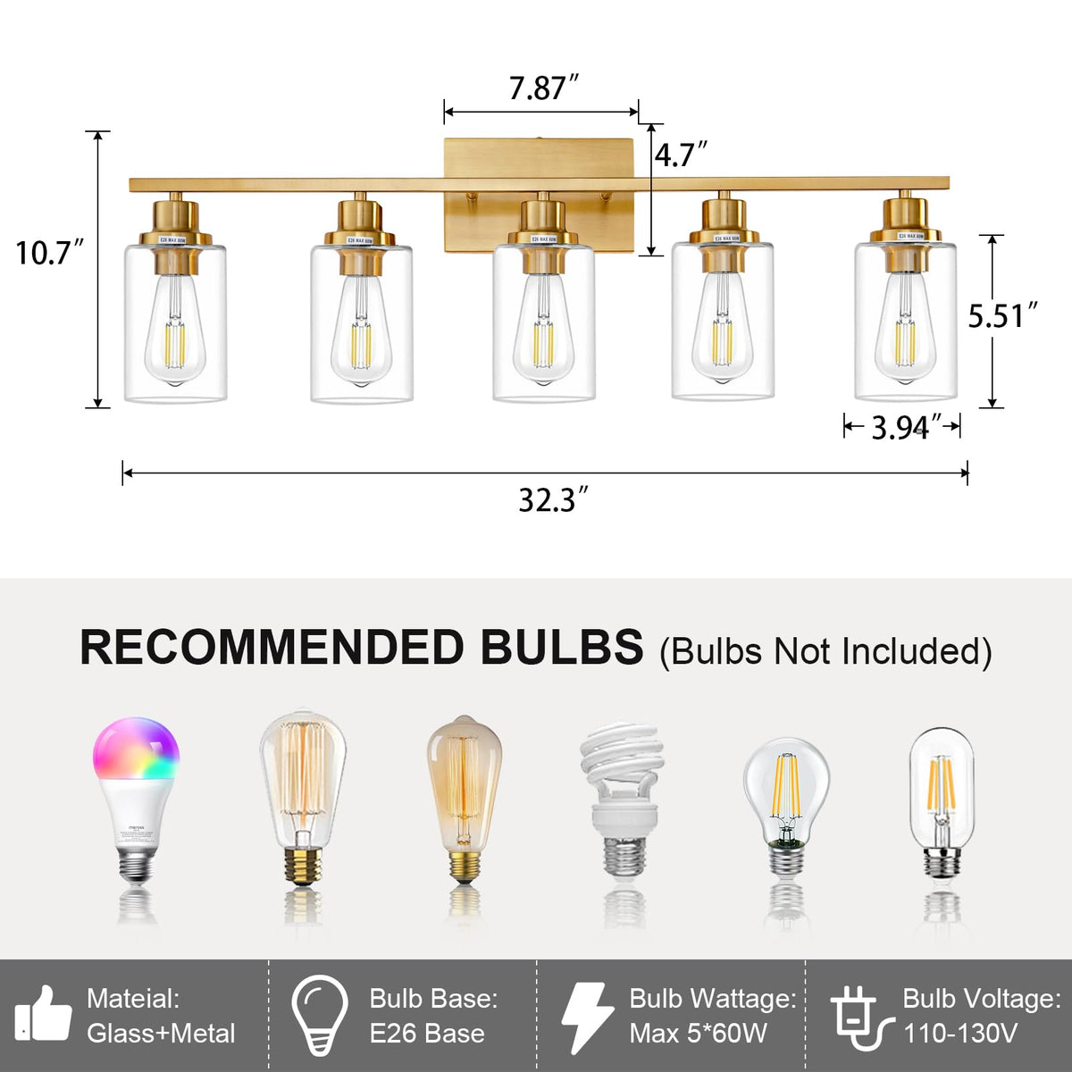 Hccz 5 Light Gold Bathroom Light Fixtures Brushed Brass Vanity Light Over Mirror Modern Wall Lighting Sconces Wall Lamp For Bath