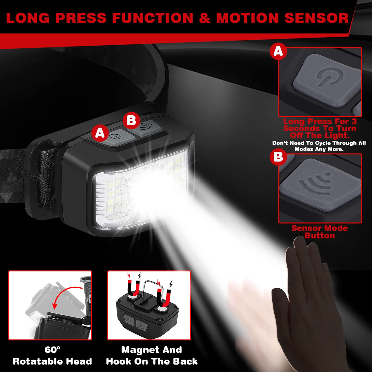 Q: What features does the motion sensor provide for this headlamp?A: The headlamp includes a motion sensor mode that allows users to easily turn the light ON or OFF by simply waving their hand, which is particularly convenient for when hands are dirty or occupied.