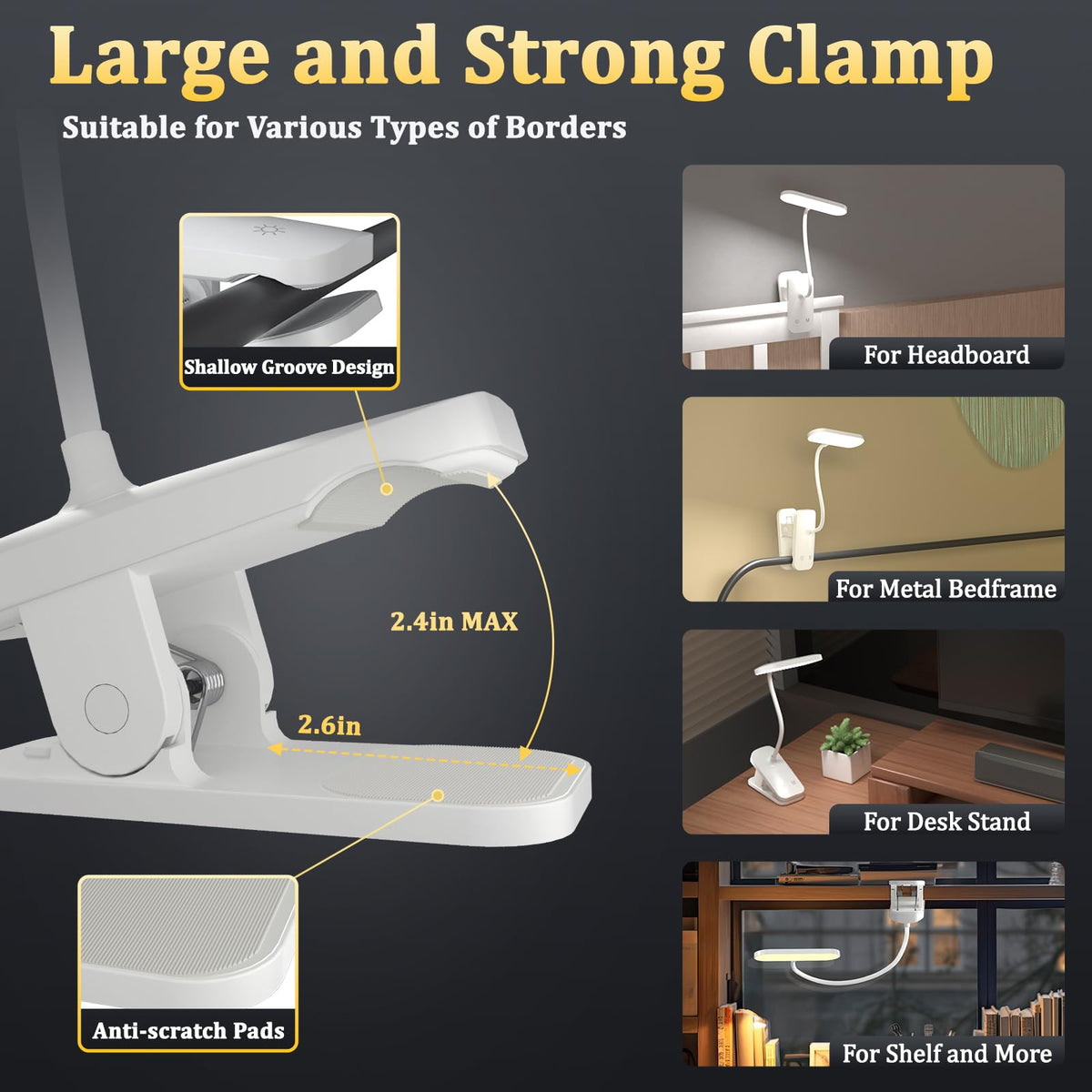 Q: What surfaces can the clamp attach to?A: The sturdy clamp of the HECDSTLY Desk Lamp can securely grip surfaces up to 2.4 inches thick, making it ideal for attaching to headboards, desks, shelves, and more.