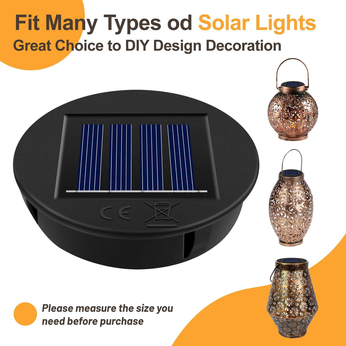 Features: Solar Lantern Lights Panel Adopts Solar Power And No Need For Extra Wires.&Nbsp; Perfectly Suited For Outdoor Garden Patio Hanging Lanterns And Diy New Crafts Specifications: Size: Outer Ring Diameter: 3.15 Inches Height: 0.9 Inches Color: Black Material: Plastic Package List: 4Pcs Solar Replacement Tops Tips: 1. Please Allow A Little Error In The Size Due To Manual Measurement. 2. Please Make Sure The Solar Panel Being Put Under Direct Sunlight. 3. Please Turn On The Switch Before Charging.