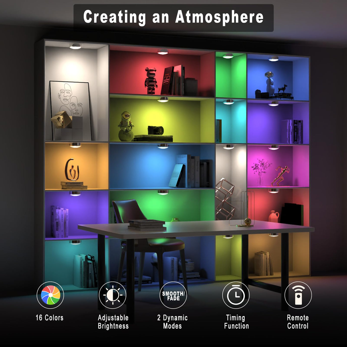 Puck Lights, 16 Colors Changeable LED Puck lightings Battery Powered dimmable Under Cabinet Lights Wireless Under Counter Lights Mini Night Light, with 2 Remote Controls & Timing Function