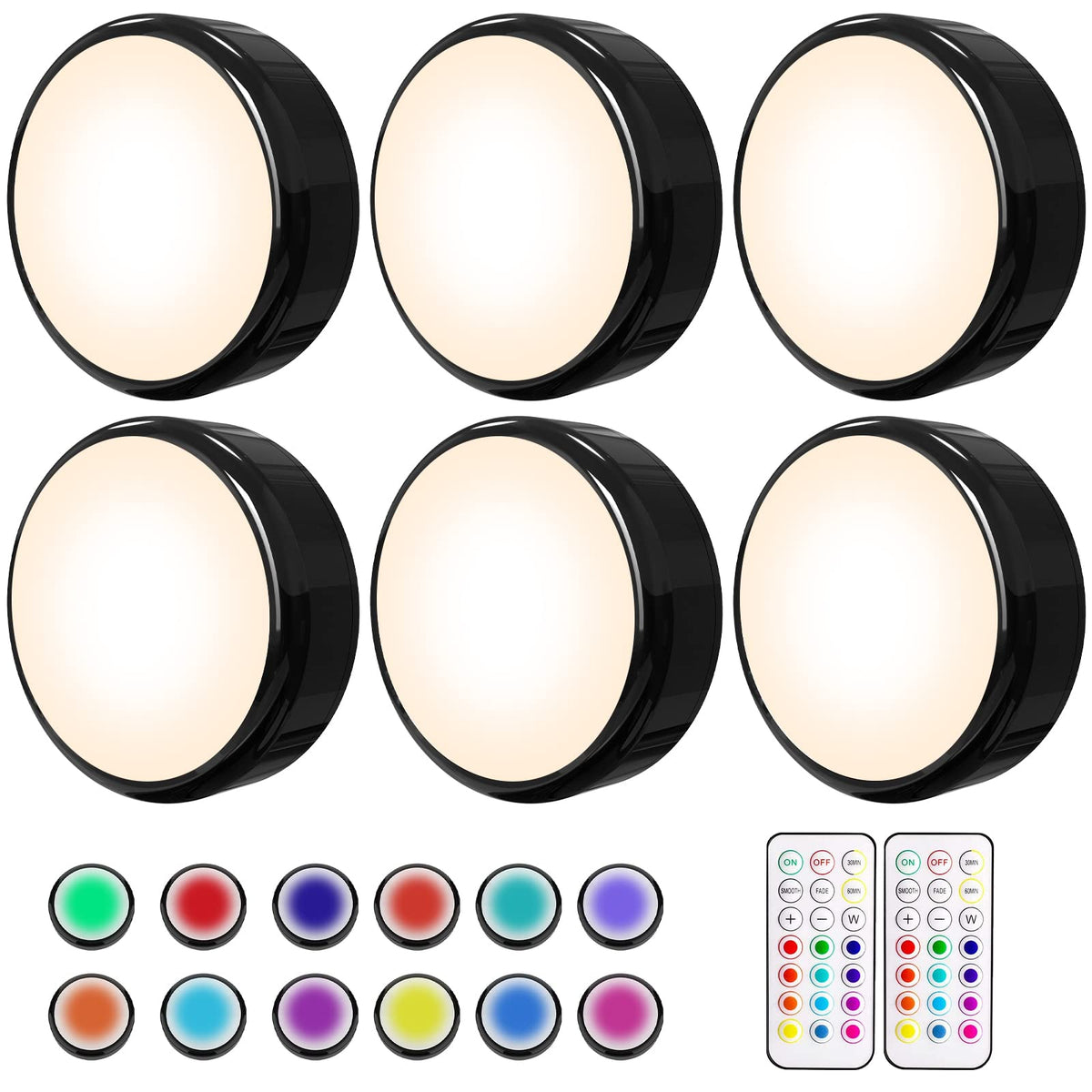HELPLEX Puck Lights, 16 Colors LED, Battery Operated, Dimmable, Wireless Under Cabinet Lighting, Black, 6 Pack, ABS Material