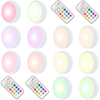 Battery Powered Lights Under Counter Lighting Stick On Lights 12 PACK No wire to run, no drilling holes in the walls, easy to install, and space saving. Touch or remote control: touch lights individually and select individual lights or all of them with remote. Provide just the right amount of ambience. Perfect lighting for kitchen and laundry room, bathroom, basement, jewelry shelf, etc. Warm Tips: The lights needs 3 AA batteries (not included). About the Control: ON/OFF: wireless remote operation to turn light on or off 30MIN/60MIN: turn off lights after 30 or 60 mins Smooth - light changes from red and cycle through all the color options Fade - light is dimmable gradually to the min and strengthen to the max Button + / -: to adjust brightness 13 Color buttons optional Specification: Lumen: 55lumens Remote distance: within 20FT Size: 77*77*32MM Shipping weight: 707grams Package Include: 12 * Puck Lights 4 * Remote Control 12 * Double Sided Tapes 2 * User Manual