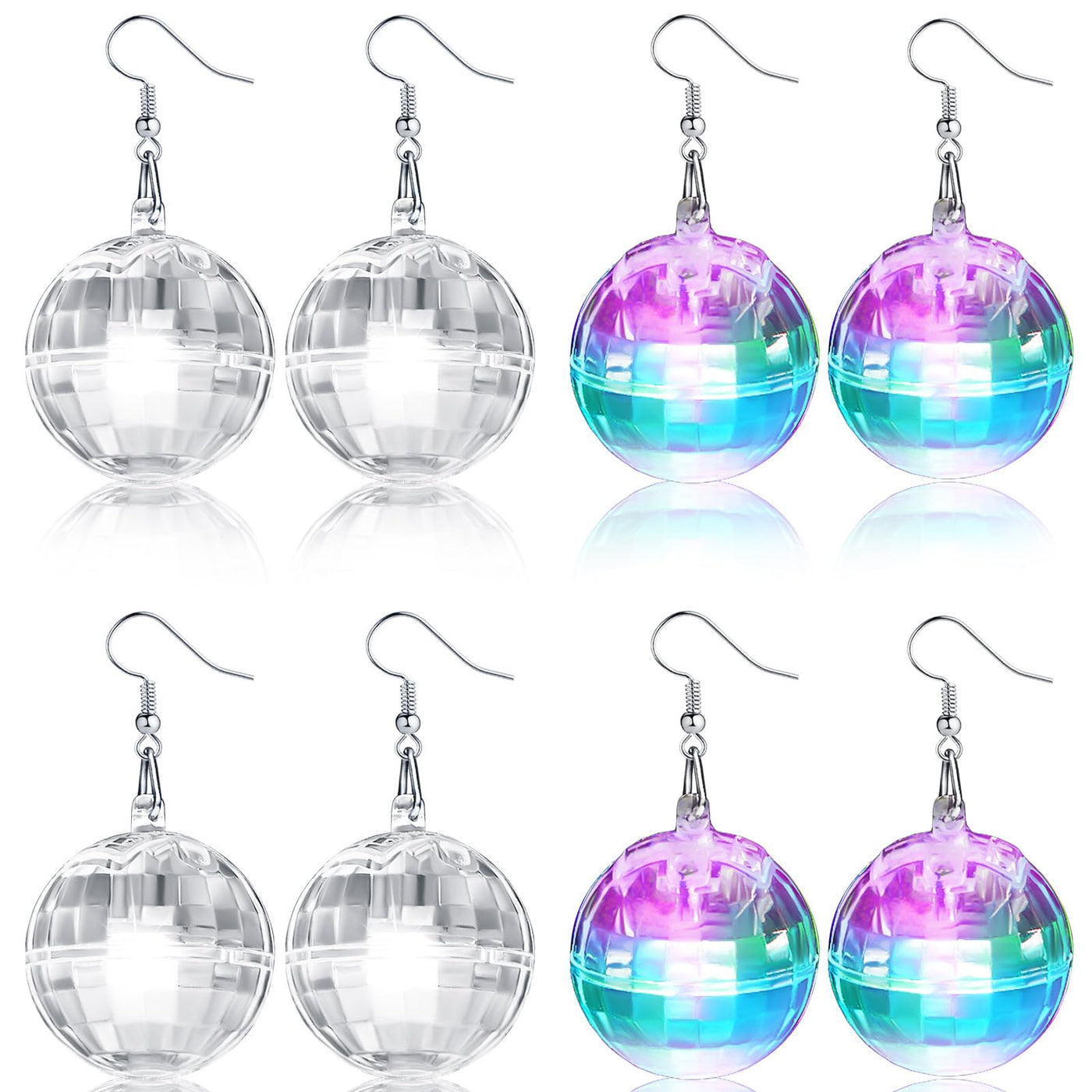 Q: What is included in the package of Henoyso Disco Ball Earrings?A: The package includes four pairs of light-up disco ball earrings, providing sufficient quantity for various outfits and occasions.
