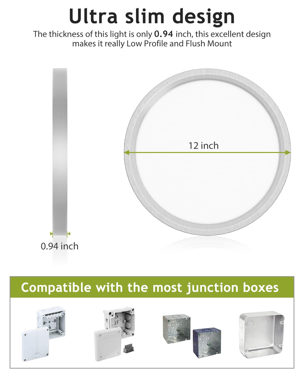 Hepside 1Pack Flush Mount Led Ceiling Light Fixture Brushed Nickel, 12Inch 28W, Dimmable 3000K-4500K-6000K 3 Color Selectable Ceiling Lamp 3200Lm Low Profile Ceiling Light For Kitchen Bedroom Hallway