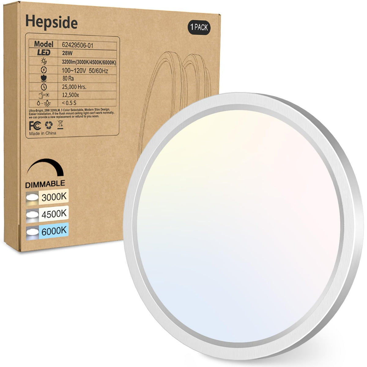 "Equipped with 100 powerful leds, Using high quality of fire-resistance plastic, Hepside led ceiling light can provide a super bright illuminance for a wide area.If you want to make your home life more stylish and brighter, Hepside low profile ceiling light can provide you with the answer... Hepside stylish LED Ceiling Light with Ultra-thin design is multi-functional and energy saving. Gentle Night Light Modes to help those who have sleep anxiety to sleep more peacefully at night. Adjustable Brightness Modes to provide more flexibility. 3 Optional Color Temperatures to meet your daily needs. High CRI >85, provide vivid and natural lighting in your room. Easy to Install + Super Bright + Eye Protection Lifetime Technical Support, we are your strong backing all the time. Specifications: Voltage: AC100-120V Power: 28W (equal 250W Incandescent) Lumen: 3200LM CRI: >85 Light beam Angle: 120° Lifespan: 25000 Hours Material: PC Product Diameter/Thickness:12*0.94inch Waterproof & Dustproof: Yes Packing Lists: 4 x 28W LED Ceiling Light 4 xConnector 12 x screws 1 x User Manual Color and Brighness Adjustable The color modes between: 3000K-4500K-6000K The brightness range you can adjust from 10%-100%, give you more convenience and choice. Warm Tips for LED Ceiling Lights : Please confirm the relevant parameter before purchase to ensure the lamp is suitable for you. Make sure to cut off the power source before installation. Clean with a slightly wet and soft cloth. Please do not use any cleaning or abrasive solutions. Energy Saving and Time-saving Replace double 250W Incandescent lights by 28W LED flush mount ceiling light, and the long lifespan will save your effort and maintenance cost. NO Flicker and Eye Protection Adopted high quality LED inside, it emits uniform bright and stable white light without flickering, no blue light, avoid eye fatigue and protects your eyes from glare light. IP54 Waterproof & Dust-proof Sealed design to protect against water splash at any angle, no worry about using in wet rooms. Dustproof rating prevents dust from entering the light and ensure no black spot on light after long-time using."