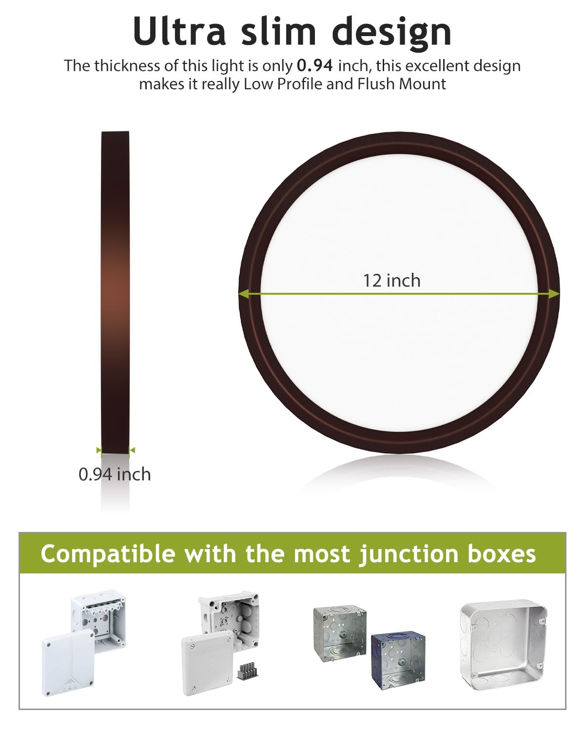 Hepside 2Pack Flush Mount Led Ceiling Light Fixture Oil Rubbed Bronze, 12Inch 28W, Dimmable 3000K-4500K-6000K 3 Color Ceiling Lamp 3200Lm Low Profile Ceiling Light For Kitchen Bedroom Hallway