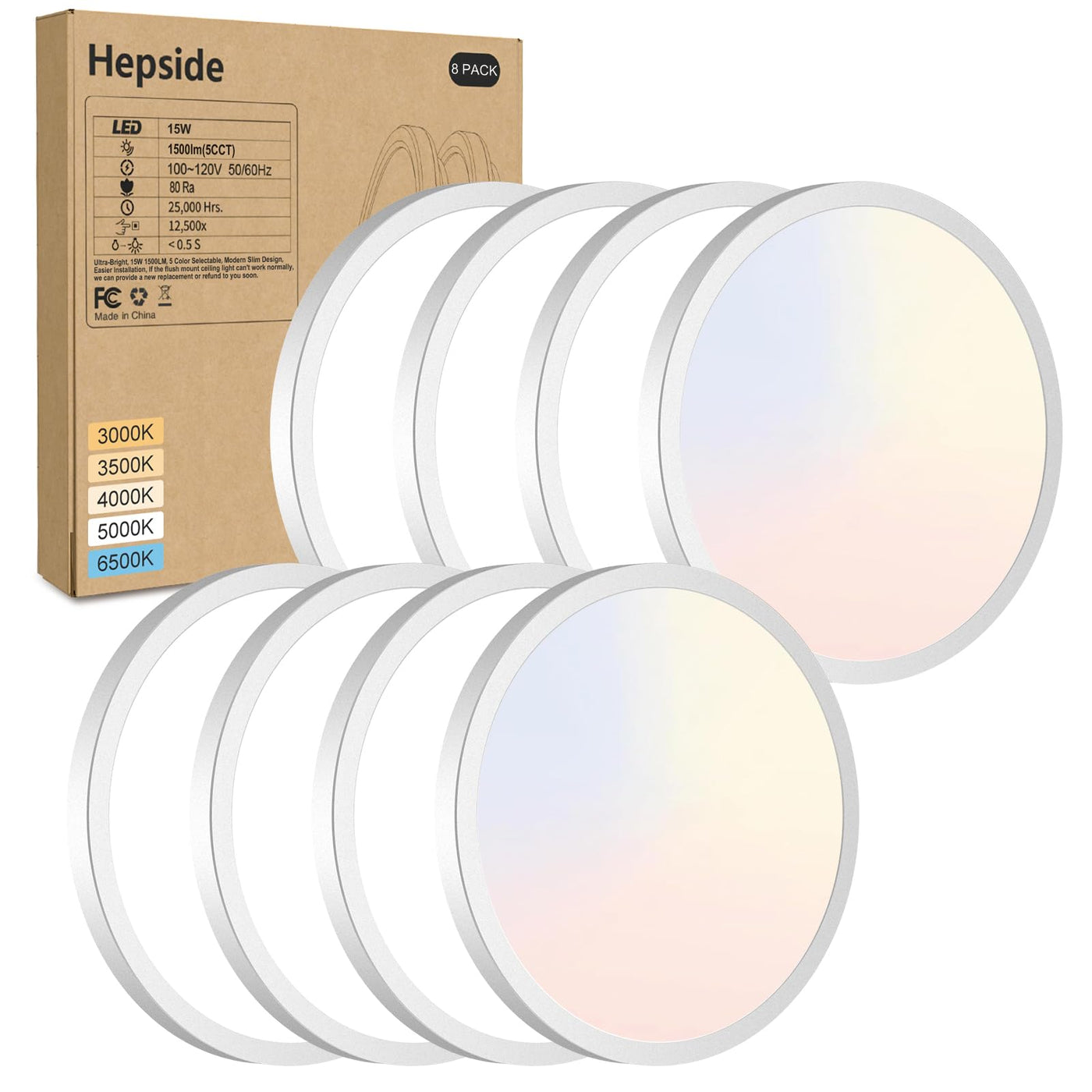 Hepside 8-Pack LED Flush Mount Ceiling Light Fixture, 15W, Dimmable, 3000K-6500K, 7-Inch, White