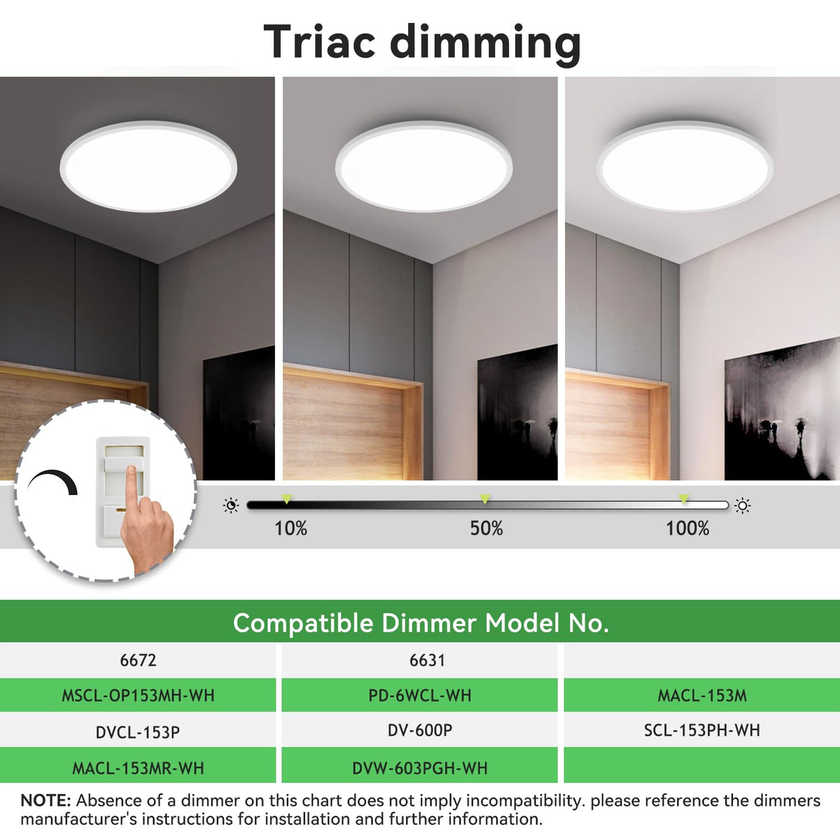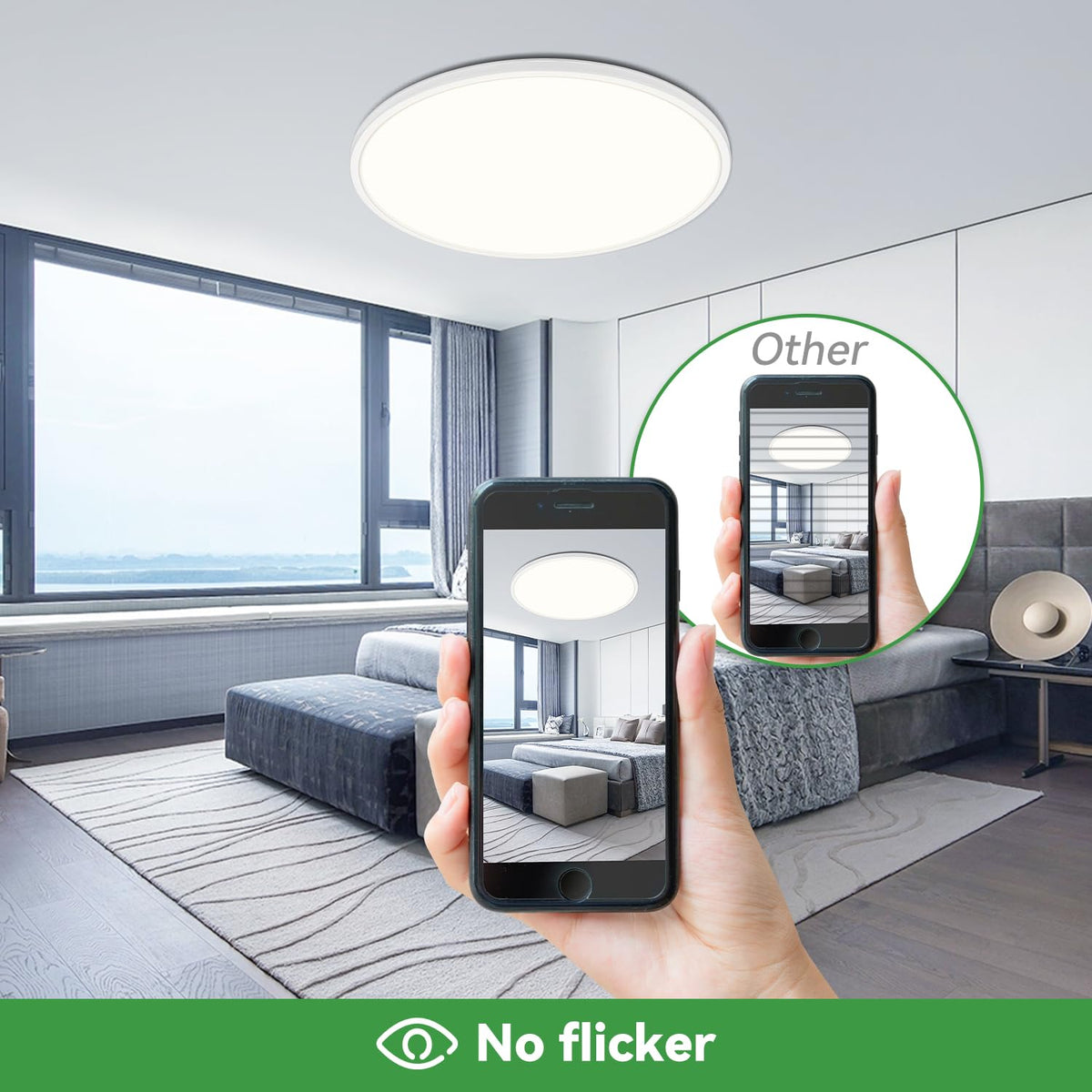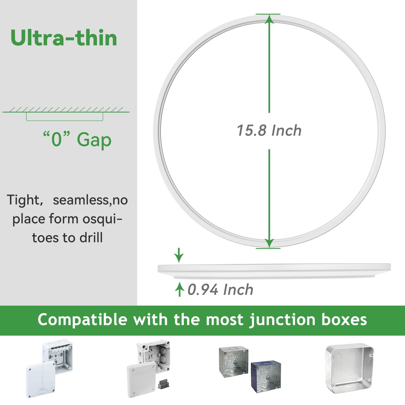 This ceiling light features a sleek, ultra-slim design, measuring 15.8 inches in diameter and only 0.94 inches in thickness. Constructed from well-made, fire-resistant plastic, it ensures safety while providing robust illumination. The light is equipped with 100 powerful LEDs, delivering up to 4200 lumens of brightness, equivalent to a traditional 100W incandescent bulb, while consuming only 36W of power. With three adjustable color temperatures—3000K warm white, 4500K natural white, and 6000K daylight white—you can easily customize the ambiance to suit your preferences.