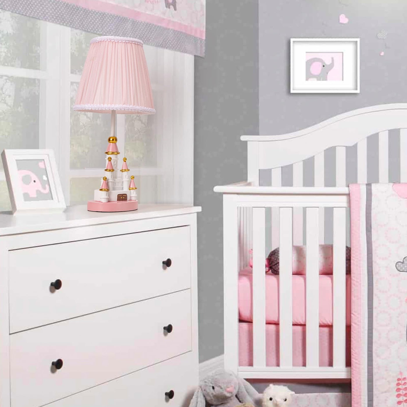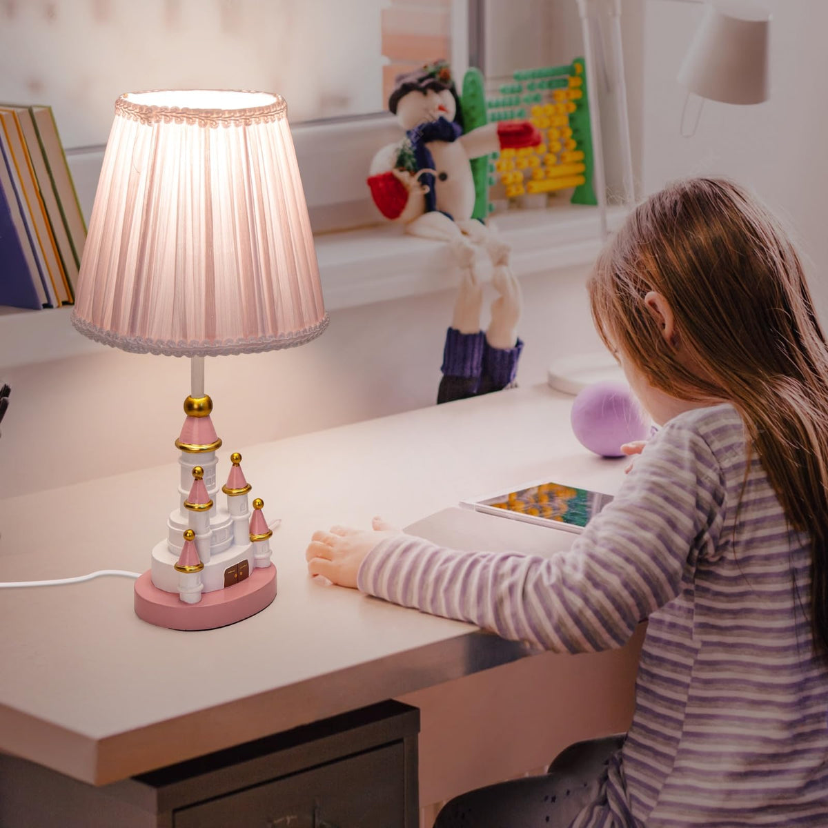Q: What are the dimensions of the pink castle table lamp?A: The HERBESTBAY Kids Table Lamp measures 9 inches in length, 9 inches in width, and stands 14 inches tall, making it a perfect bedside lamp for any child's room.
