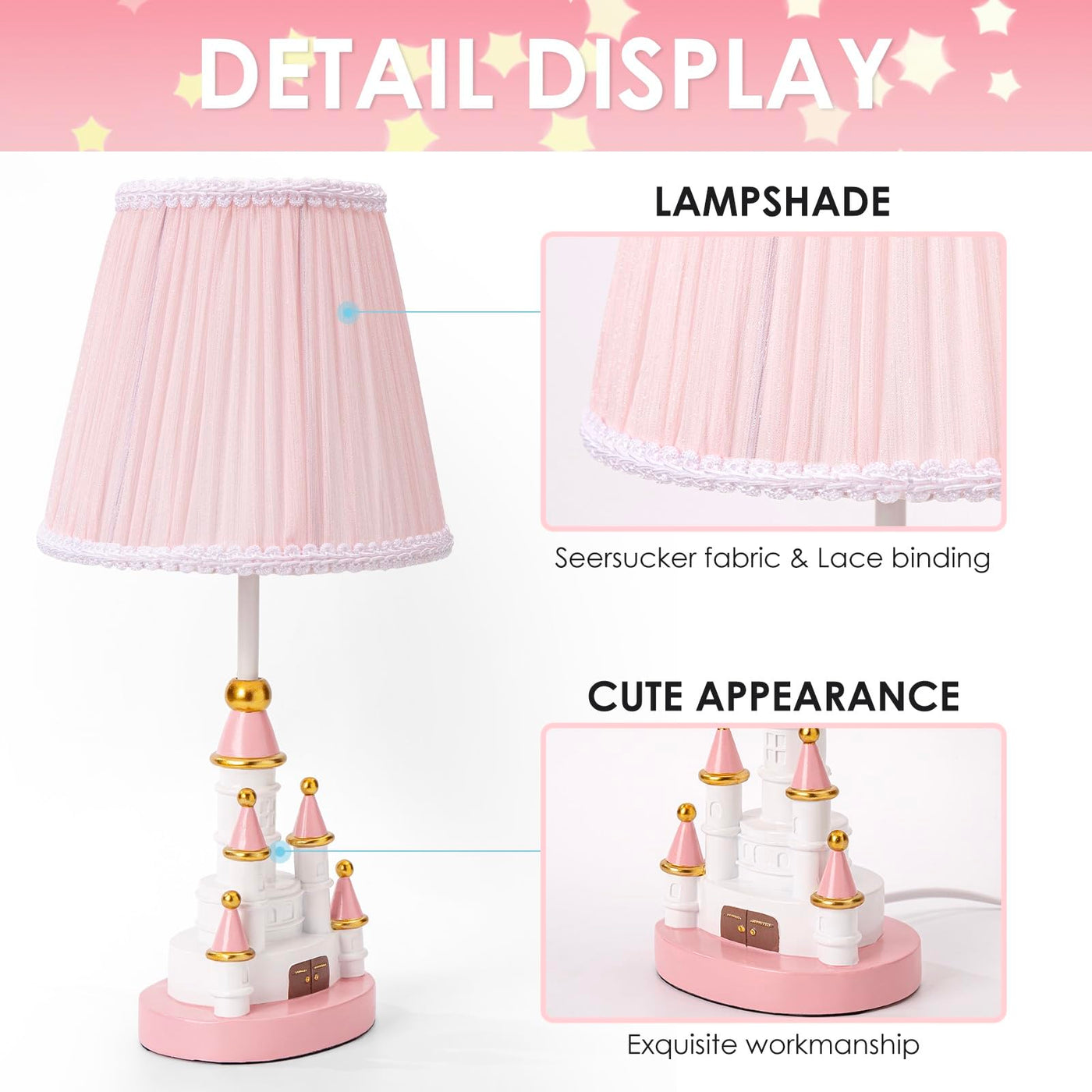 Our Story We Are An Entrepreneurial Garage Company. Although We Have A Limited Number Of People, We Always Ensure That There Are Two Quality Inspectors To Carry Out Strict Quality Control And Provide Our Customers With A Pleasant Shopping Experience. Our Dream: Bring More Cozy Light To Every Families' Little Ones Detail Type: Pink Castle Table Lamp Light Body Material: Resin Shade Material: Fabric + Pvc (Colored Dots) Light Source Type: Led, Incandescent, Fluorescent Accessories: Come With An E26 Led Bulb Plug Cord: Ul Standard Voltage: 110V~115V (Inclusive). Power: 21W (Inclusive) -40W (Inclusive) Applicable Space: Living Room, Study Room, Bedroom Other Pink Castle Table Lamp Size 9 In (Length) X 9 In (Width) X 14 In (Tall) Pink Castle Table Lamp