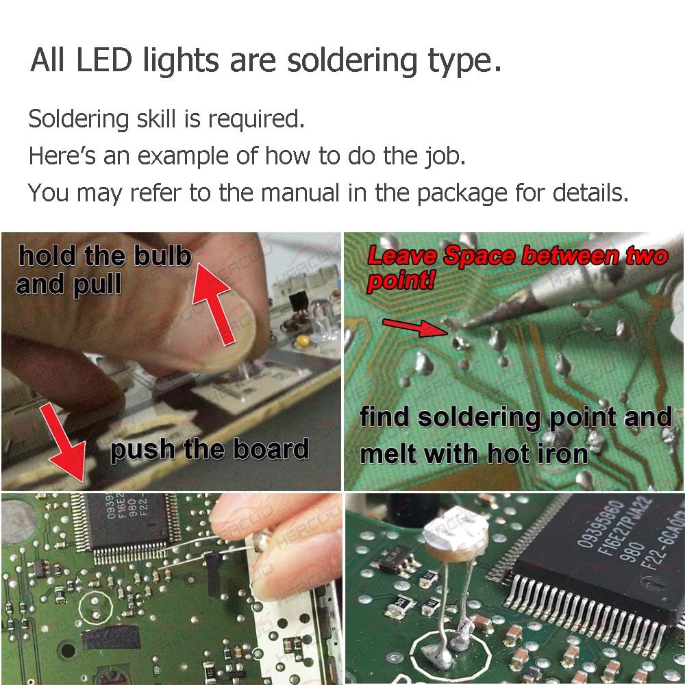 Brilliant, stylish and sharp-looking LED light bulbs. Perfect improvement for the dim and dull-looking halogen bulbs. Upgrade your AC heater climate control with our amazing LED Kit! Low Power Consuming and low heat. Long-lasting, above 20,000+ Hours lifetime. Buyer Notice Before Ordering: This is an assortment of LED light bulbs to replace the stock halogens. Its NOT ASSEMBLY PANEL. Its NOT ASSEMBLY PANEL. NO WIRING INCLUDED. Installation Requirement: All LED lights are soldering types, just the same as stock ones. Soldering skills required. You have to take the unit apart and soldering them directly to the board.Feel free to send us message first if you have any doubts or difficulties. Compatible with Various Models as following:for the following models with dual manual climate control ONLY, NOT for unit with automatic function. Compatible with Chevy Silverado 1500 2003-2006 Silverado 1500 HD 2003-2006 Silverado 2500 2003-2006 Silverado 2500 HD 2003-2006 Silverado 3500 2003-2006 Avalanche 1500 2500 2003-2006 Tahoe 2003-2006 Suburban 2003-2006 Trail Blazer 2005-2009 Compatible with GMC Sierra 2003-2006, NOT for Denali Yukon 2003-2006 Yukon XL 2003-2006 Envoy 2005-2009 Envoy XL 2005-2009 Envoy XUV 2005-2009 LED Features: LED Color: White LED Luminance: SMD LED LED Illumination Applied to: Fan Speed Control, Temperature Control, Air Flow Mode Selector Control, A/C/Air Conditioning, OFF/Power, PANEL/VENT, Panel & Floor/MIX/BI-LEV, FLOOR/Heater, Floor & Defrost /BLEND, DEF (Defrost), Rear Defrost/Defogger