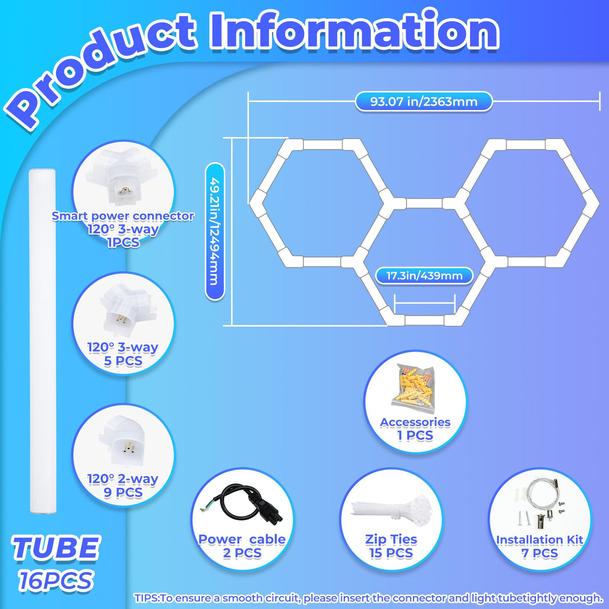 Led Shop Light This Is A Hexagon Patterned Garage Light Led Workshop Lighting System Can Be Mounted On The Wall And Ceiling Use Screws And Zippers. The Light Spread From The Pattern Gives You A Comfortable Visual Experience While Illuminating An Entire Garage Bay. Which Brings The Idea Of Lighting Up Your Space To A Whole New Level. Hexagon Garage Led Light Diy Diversity Installation Effect: Tubes Can Be Installed Into Cool Light Shapes According To Personal Preference, Creating The Perfect Cool And Premium Ambience For Your Space. If You'Re Looking To Light Up Your Garage, Or You Have A Shop That Needs Some Dressing Up, These Lights Are The Answer. These Lights Are Extremely Popular In The Automotive Industry For Dealerships, Detailing Shops, Car Washes, Vinyl Wrap Shops, And Paint And Auto Body Shops. They Are Also Popular In Retail Shops, Gyms. Led Shop Lighting & Hexagon Garage Lights Led Shop Lights For Garage Led Garage Ceiling Llights Features: 1. The Lamp Tube Is Wider, The Light-Emitting Surface Is Larger And Brighter, Wider Range Of Lighting. 2. Super Bright :14080Lm.High Quality Led Chips, Much Brighter. 3. High Safety Factor: Built-In Plug, Meet The Safety Certification Standards Of U.S, It Is Difficult For Fingers To Touch The Plug. 4. The Led Shop Lights Installation Is Tighter Than Other Shops And Not Easy To Loosen. 5. Diy Design, You Can Splicing Different Shapes According To Personal Preferences Garage Lighting Package: More Accessories 16 X Light Tubes -9 X ''V'' Connector -5X ''Y'' Connector -22X Nylon Cable Tie -3X Nuts -1X Power Cable Led Garage Lighting Parameters: ? Power: 168W ? Lumen: 14080Lm ?Color Temperature:5000K ? Size:93.07*49.21*1.1 Inches ? Working Temperature: -20C-50C ? Input Voltage: Ac 100-240V Led Hexagon Garage Lights Led Garage Ceiling Lights