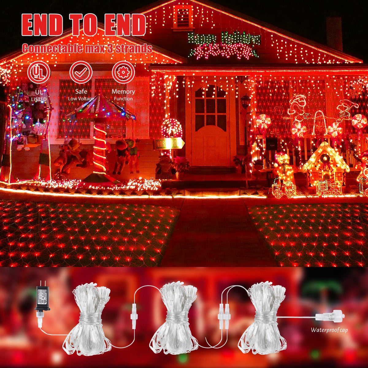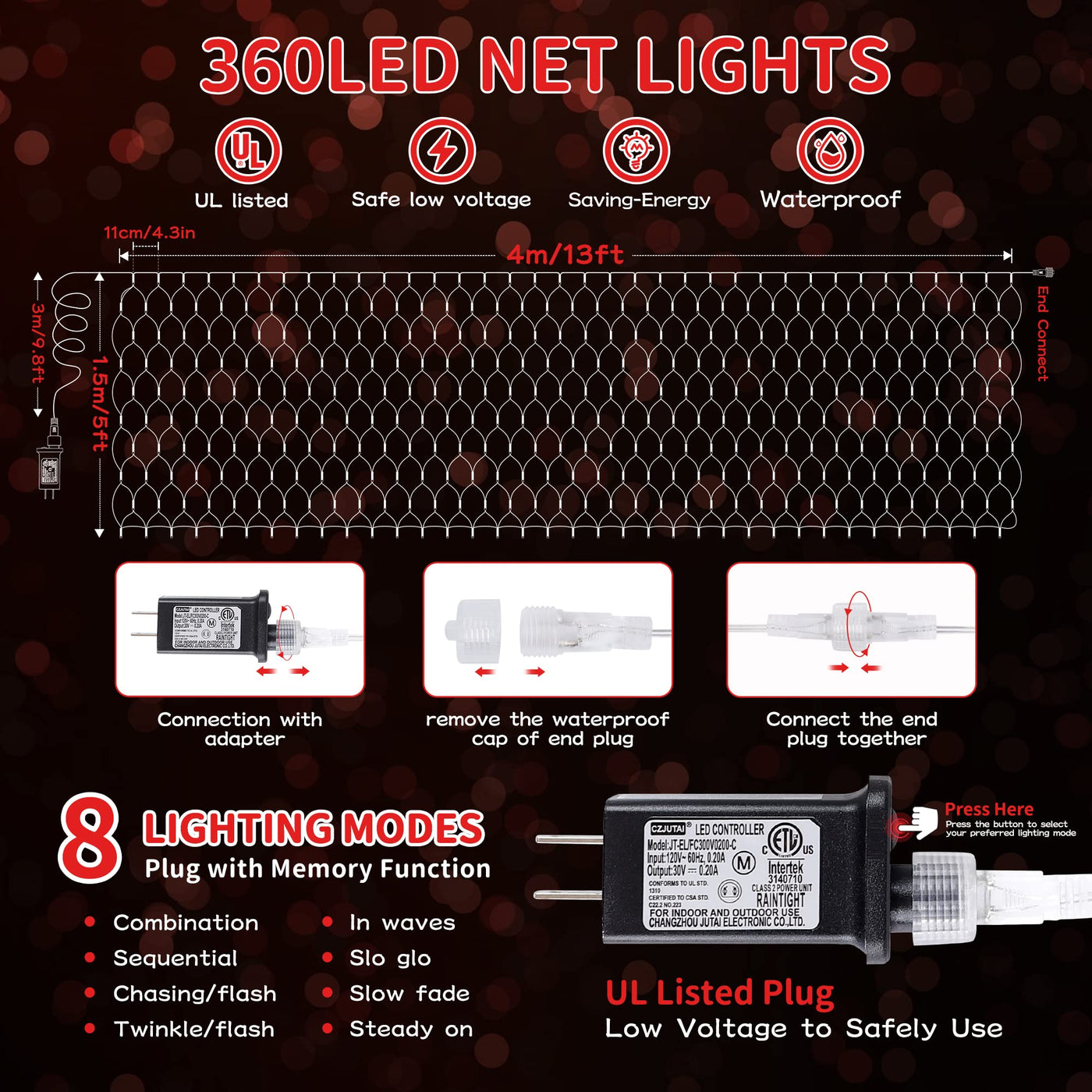Q: What are the dimensions and light specifications of the HEYFUNi Net Mesh String Lights?A: The HEYFUNi Net Mesh String Lights measure 13 feet by 5 feet and feature 360 LED red light bulbs. They come with a 9.8-foot lead cable and a waterproof end-to-end connector for connecting up to 3 sets.